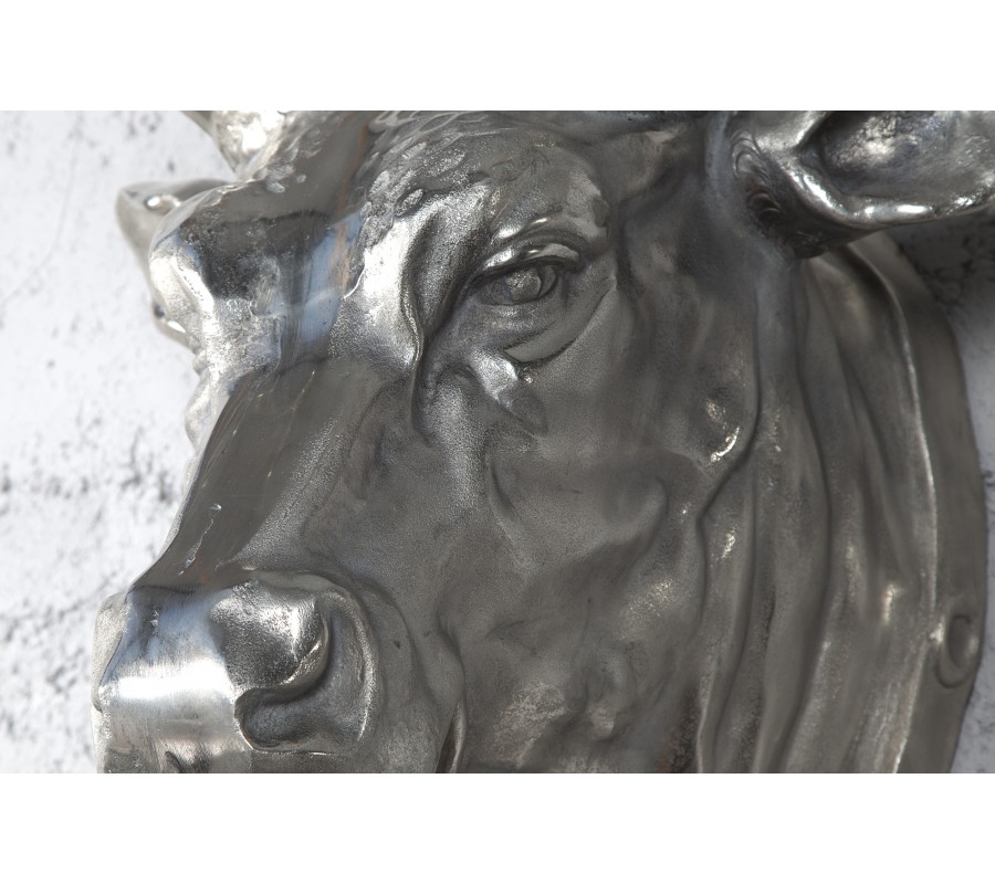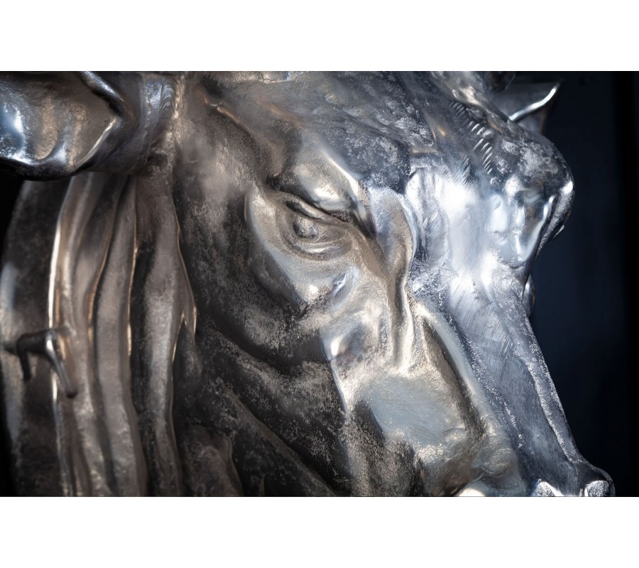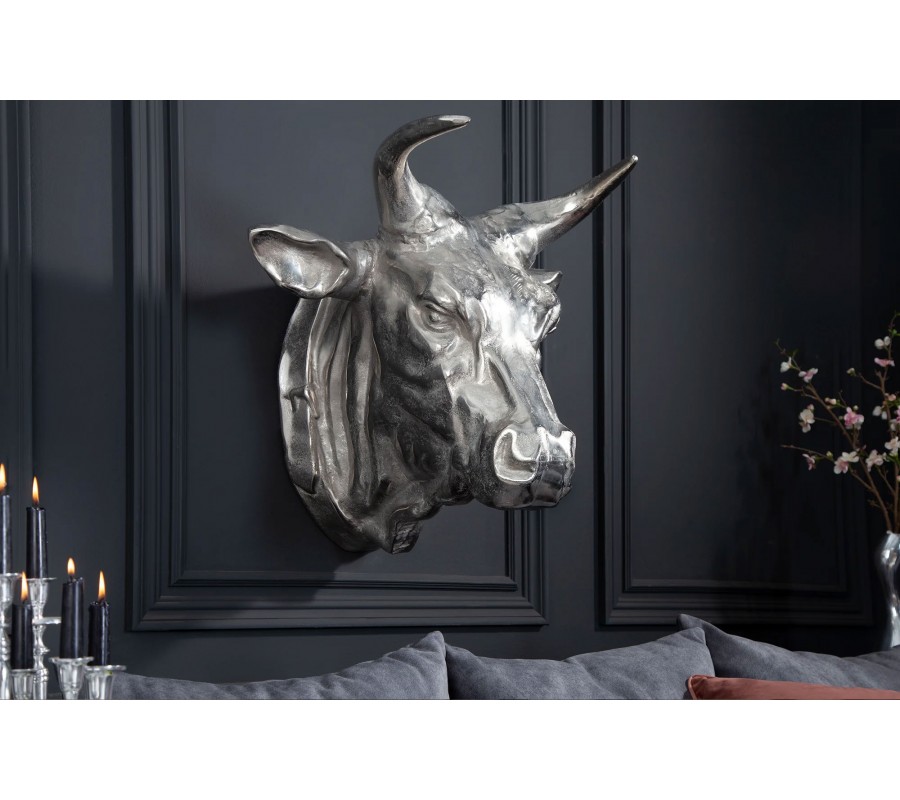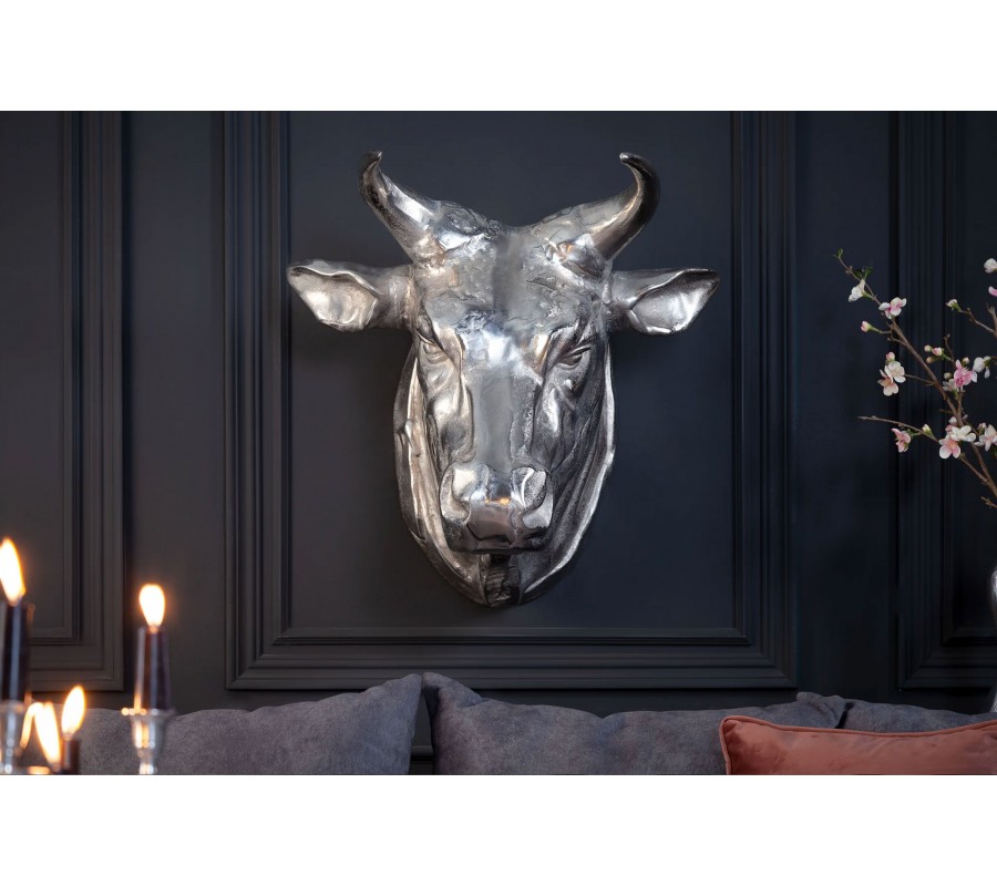 Jedinečný hliníkový odliatok hlavy býka je štýlovou dekoráciou do interiéru, a to nielen pre milovníkov zvierat. Býk bol už od starého Egypta symbolom sily, a tak nájde svoje miesto najmä v pánskych pracovniach čí obývacích izbách. Veľkosť: 65 cm x 55 cm x 55 cm (ŠxVxH) Farba: strieborná Materiál: hliník, stena zliatina dekorácie