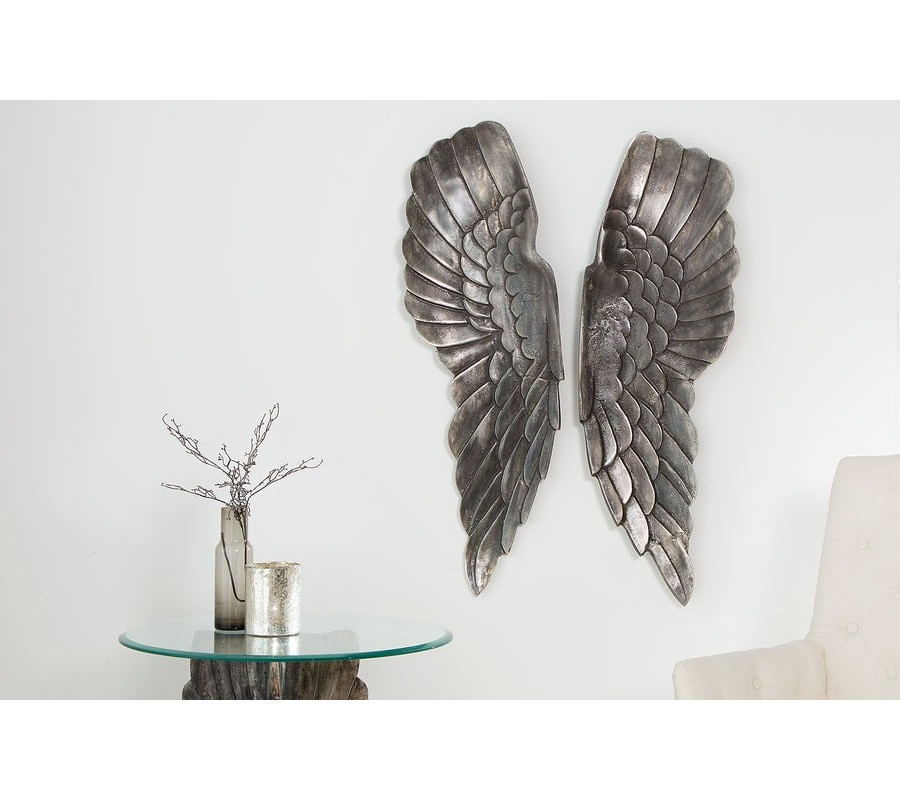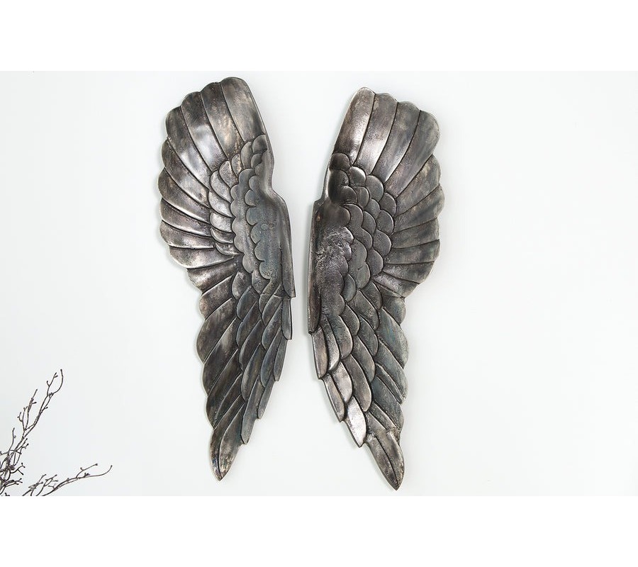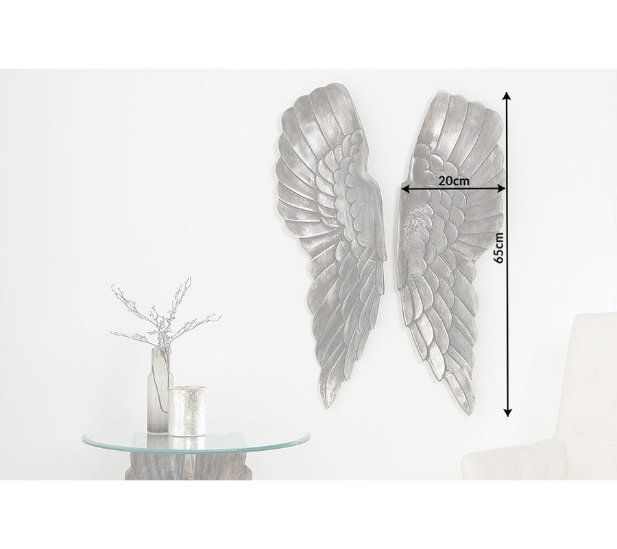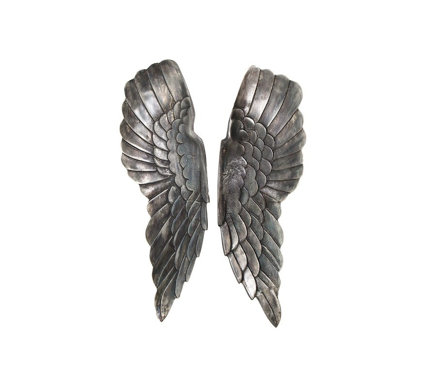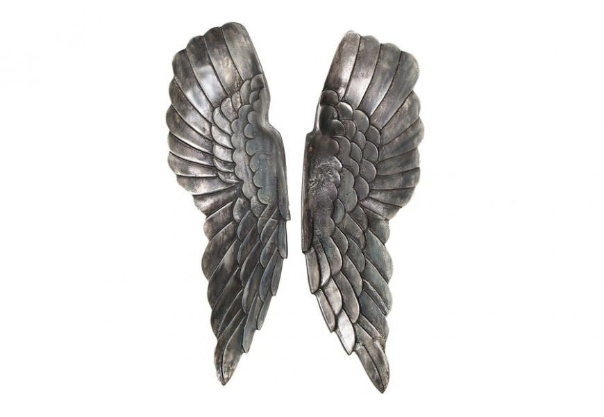 Nástenná dekorácia Angel Wings predstavuje štýlový vintage doplnok v tvare elegantných anjelských krídel. Vyrobená je z kovu so striebornou povrchovou úpravou a s jemným bronzovým patinovaným efektom, ktorý zvýrazňuje plastickú štruktúru peria. Dvojdielna kompozícia pôsobí vzdušne a súčasne luxusne, pričom lesklé aj matné odlesky sa menia v závislosti od svetla a dodávajú dekorácii hĺbku.