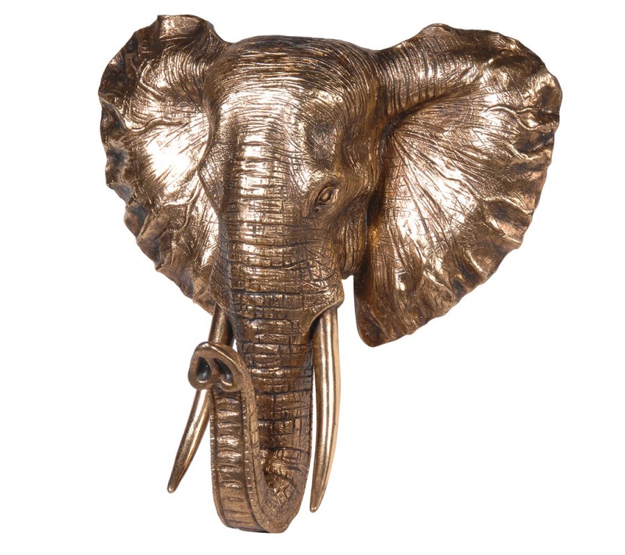 Dizajnová glamour nástenná dekorácia Hathi v zlatej farbe v podobe hlavy slona 42 cm
