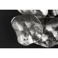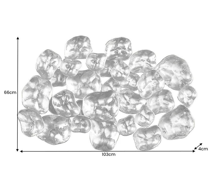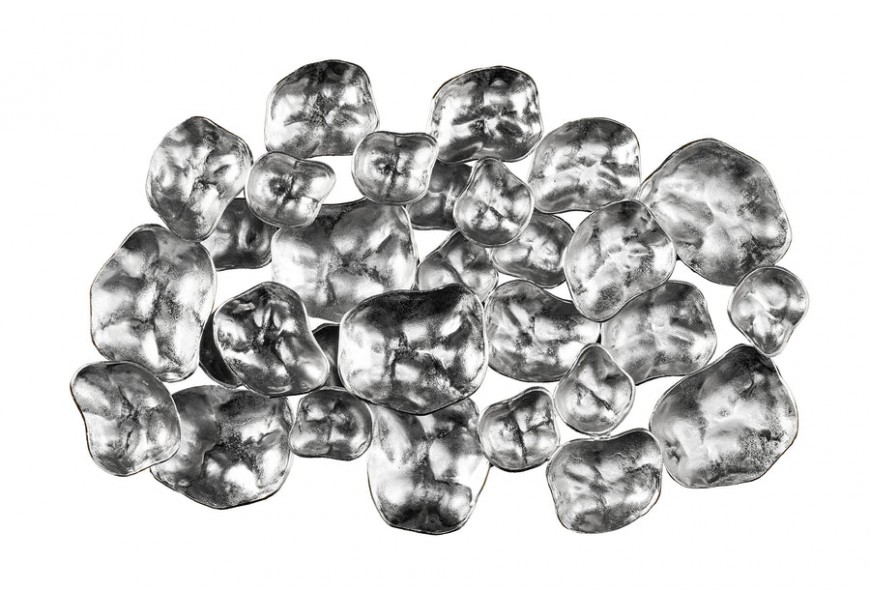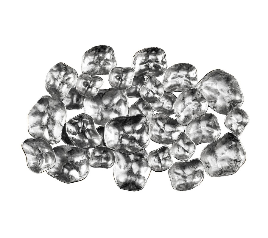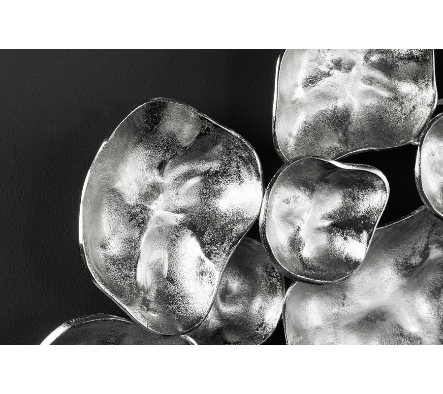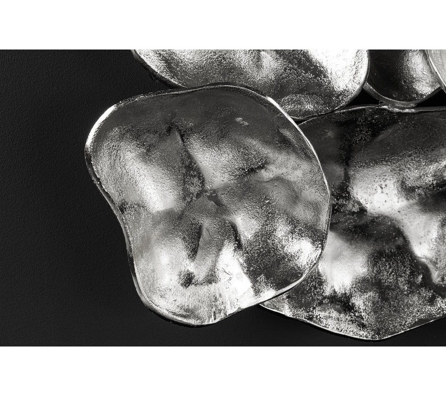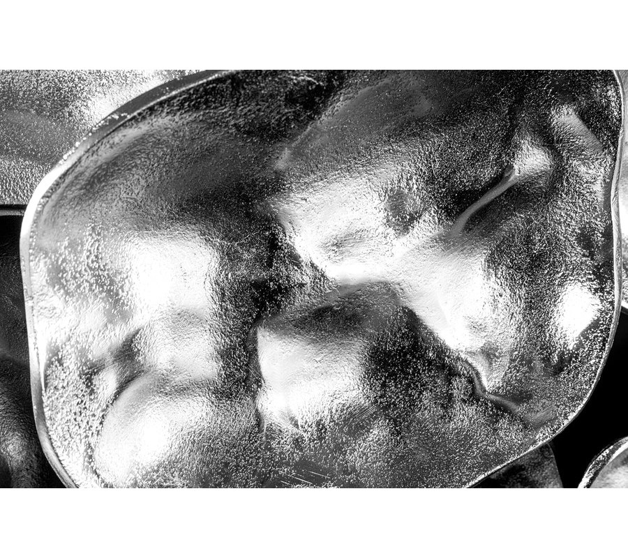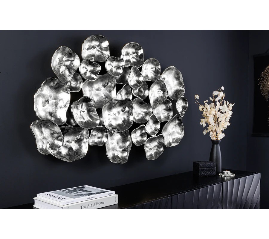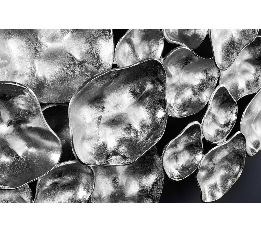 Nástenná dekorácia Varia je vyrobená z kovu a pozostáva z nepravidelných prvkov, ktoré majú prehĺbenie, čím pripomínajú organické kovové misy. Povrch je hladký a lesklý, so striebornými odleskami, ktoré pôsobia elegantne a pridávajú dekorácii luxusný charakter. Jednotlivé prvky sú usporiadané do dynamickej kompozície, ktorá vytvára jedinečný trojrozmerný efekt a priťahuje pozornosť ako umelecký prvok v interiéri, ktorý je hand made.
