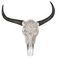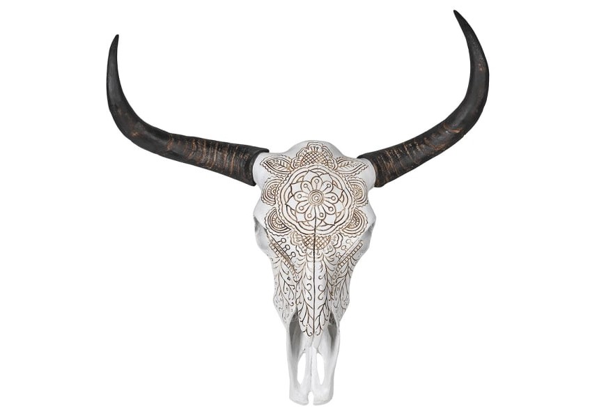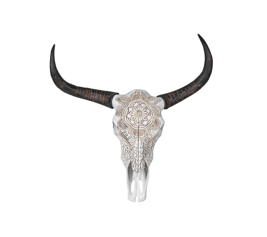 Dekoratívna lebka Cow predstavuje lebku býka s mohutnými rohmi, ktoré dodávajú objektu výrazný a dominantný vzhľad. Lebka má autentický tvar s precízne vypracovanými detailmi, ktoré verne napodobňujú skutočný vzhľad zvieraťa, avšak je vyrobená zo živice, čo zaručuje jej ľahkosť a odolnosť.