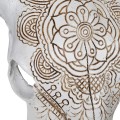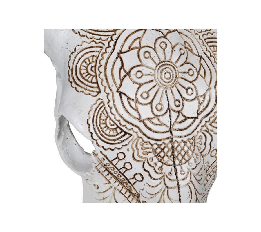 Povrch lebky je biely, s jemným leskom, a zdobia ho detailné ornamenty pripomínajúce mandalu v podobe rytín. Ornamenty sú tvorené geometrickými a kvetinovými vzormi, ktoré majú jemnú hnedú farbu a dodávajú lebke dekoratívny a umelecký nádych. Rohy sú tmavohnedé až čierne, s textúrou, ktorá imituje skutočný povrch rohov.