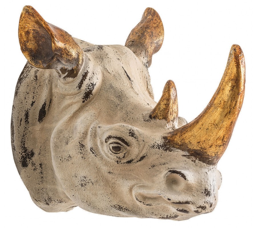 Luxusná etno nástenná socha nosorožca Rhino zo živice v krémovej a zlatej farbe s patinou 71 cm