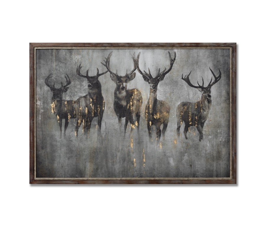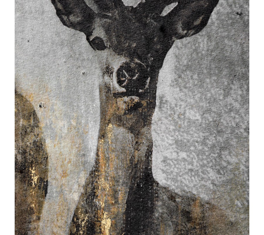 Štýlová olejomaľba s jeleňmi v rozmeroch 100x105cm je dizajnovým kúskom najmä pre milovníkov umenia, rustikálneho štýlu a originálnych kúskov. Maľba s ošarpaným starším vzhľadom je doplnená o autentický drevený patinovaný rám. Na maľbe sa nachádzajú aplikácie zlatej farby. Maľba skvelo dopĺňa miestnosti v rustikálnom alebo klasickom štýle alebo interiéri v tmavších odtieňoch, do ktorých vnáša honosné časy minulé.