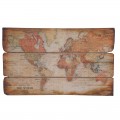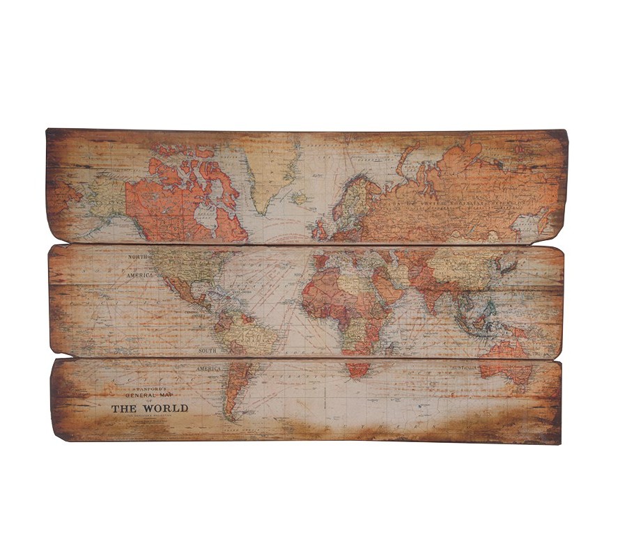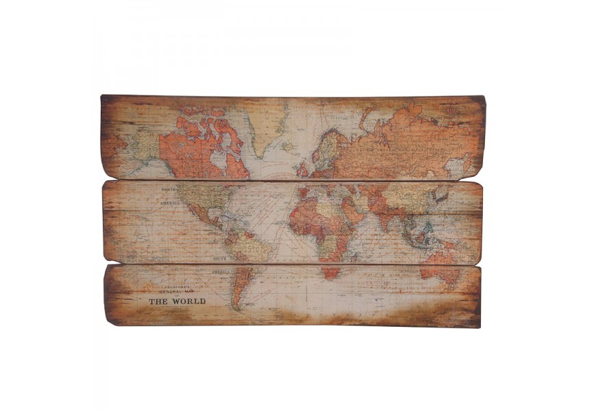 Štýlová nástenná plaketa s dizajnom mapy sveta sa nesie v koloniálnom a vintage štýle. Plaketa je vyrobená z dreva a doplnená farebnou potlačou. Dominantou plakety je jej nezvyčajný tvar pripomínajúci naplavené drevo v obdĺžnikovom tvare. Doska je zložená z niekoľko dosiek s vybieleným vyzuálom uporstred čo dodáva vintage nádych. Plaketu odporúčame kombinovať s masívnym tmavým nábytkom v obývačkách alebo predsieňach či izbách zariadených v koloniálnom alebo vintage štýle.