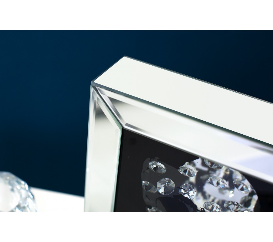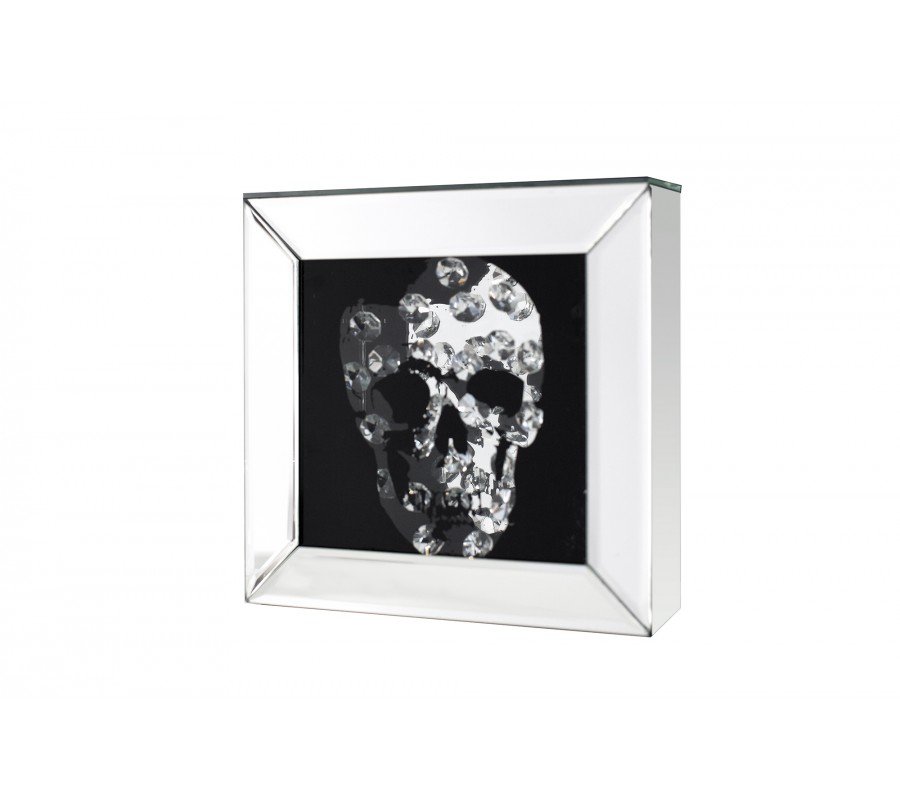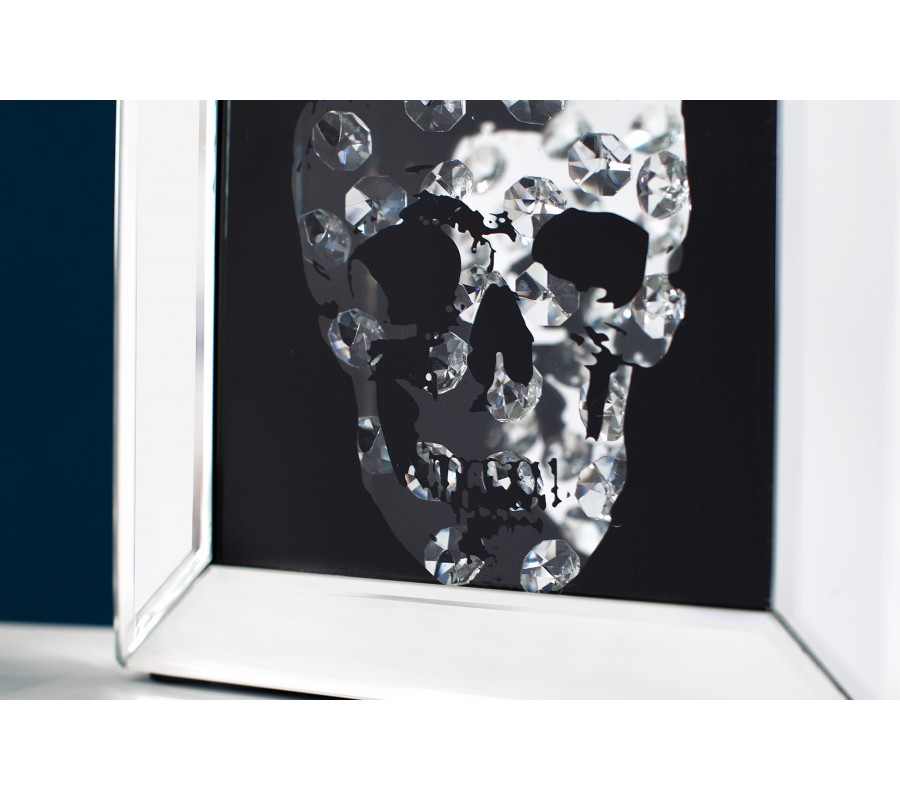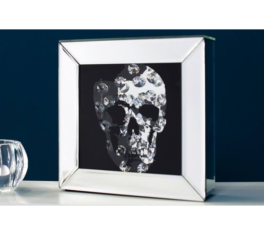 Štýlový zrkadlový obraz zobrazujúci lebku očarí každého milovníka výrazných a svojských interiérových doplnkov a dekorácií. Uprostred jednoduchého rámu vyrobeného z kvalitného zrkadlového skla dominuje na čiernom pozadí lebka tvorená drobnými sklenenými kryštálmi.