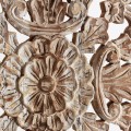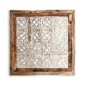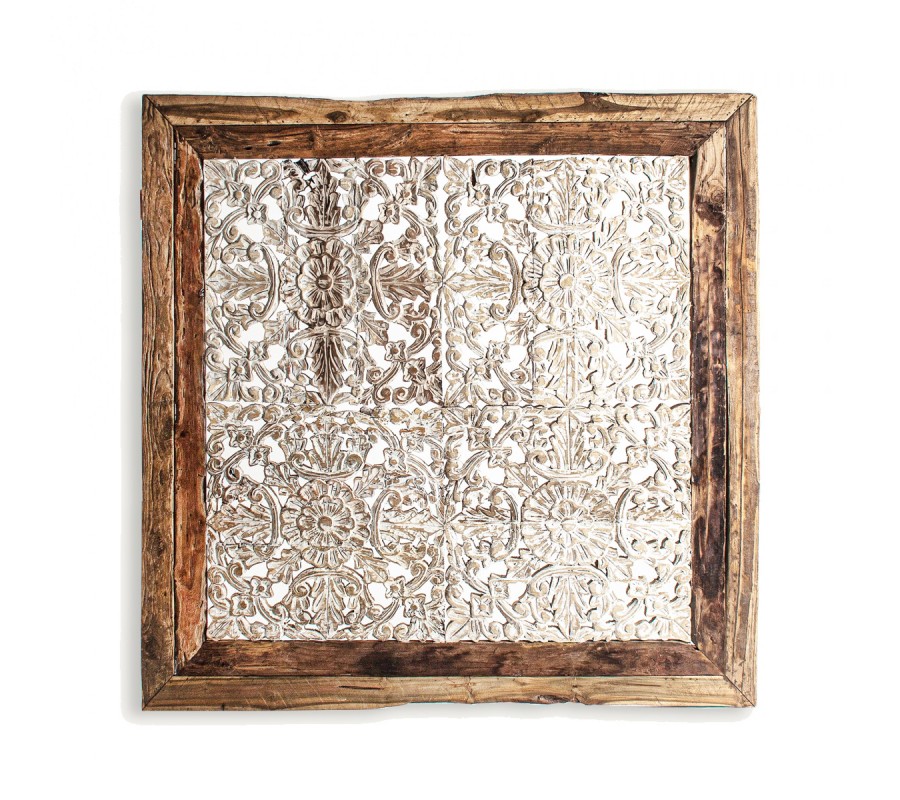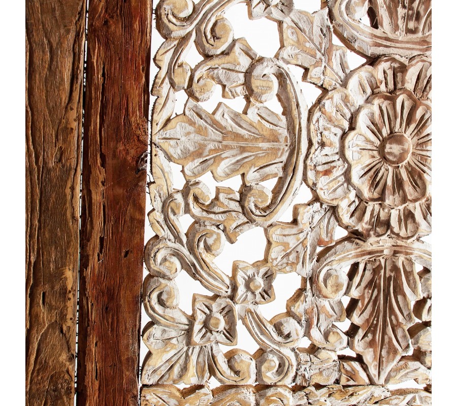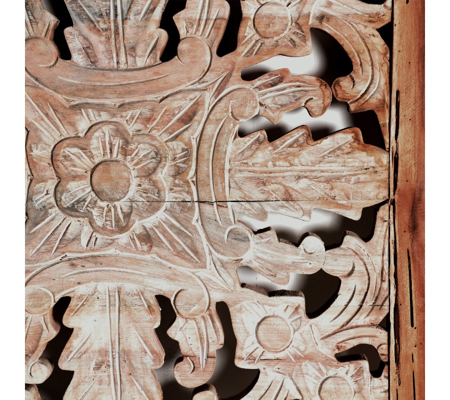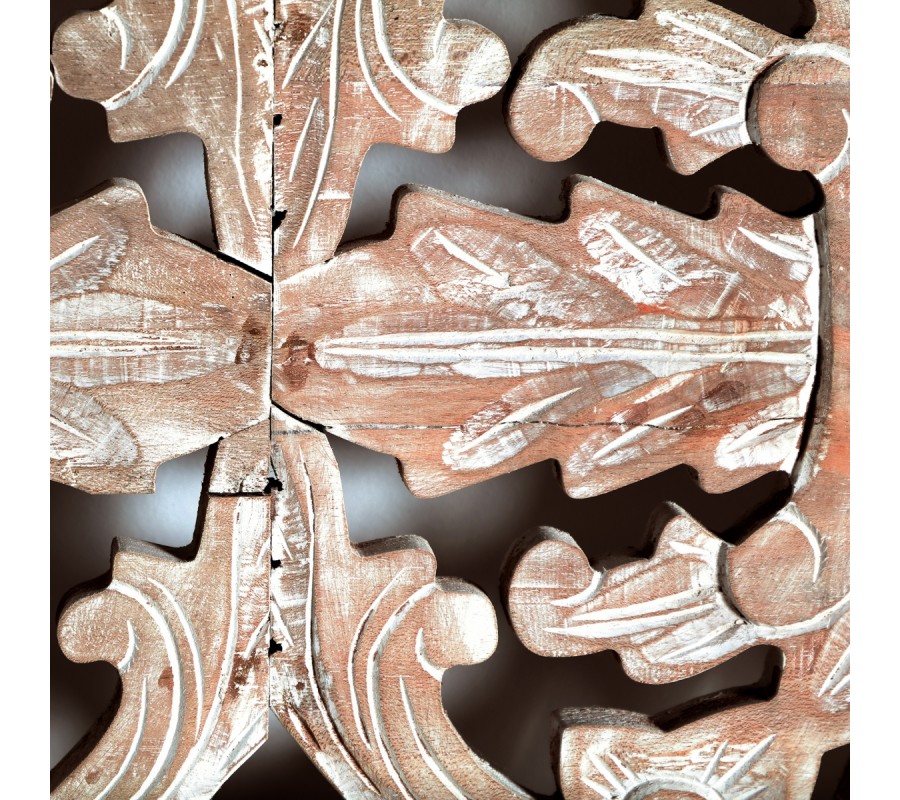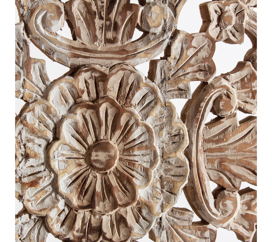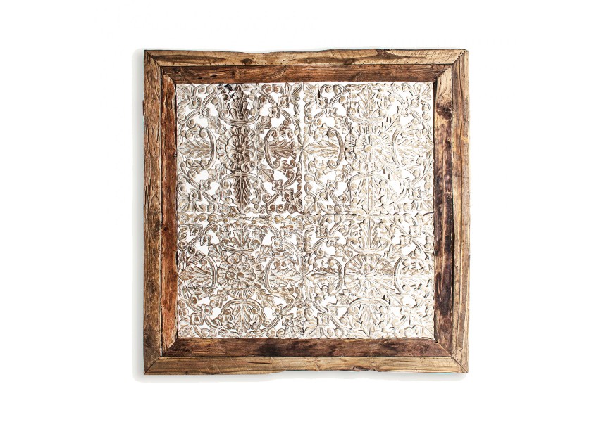Luxusná nástenná dekorácia Caribeo zaujme svojím nádherným vyrezávaným zdobením. Dekorácia je vyrobená z masívneho dreva a jej štvorcový nahrubo opracovaný hnedý rám je doplnený krsánymi florálnymi ornamentami. Precízne ručné vyrezávanie zaručuje originalitu každého kúsku, a tak si svoj domov môžete doplniť o jedinečné umelecké dielo. Rám obrazu necháva vyniknúť prirodzenú kresbu dreva a prírodná hnedá farebnosť dotvára etno vzhľad. Vyrezávané florálne ornamenty sú doplnené o patinu vytvárajúcu efekt zostarnutia. Okrem doplnenia prázdnych stien v etno či orientálne ladených priestoroch môže dekorácia Caribeo vhodne poslúžiť aj ako čelo postele. Svojou veľkosťou zapadne k masívnym posteľným rámom so šírkou 160 centimetrov.