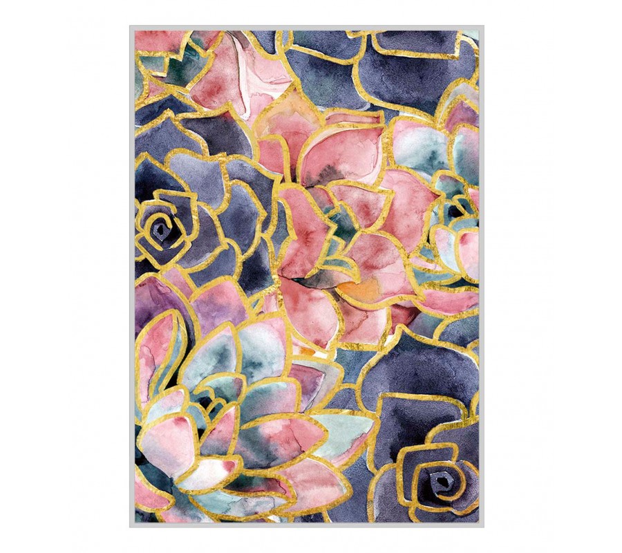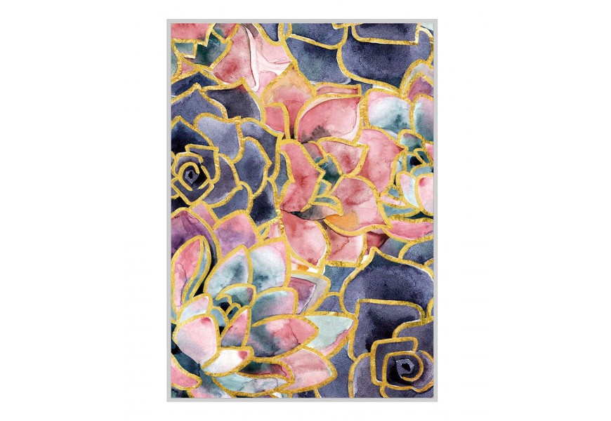 Plátno je upevnené v jednoduchom hladkom bielom ráme z dreva, ktorý vytvára kontrast k pestrému vizuálu a sústreďuje vašu pozornosť na samotné dielo. Na plátne sa odvíja motív kvetov ruže v modernom prevedení. Tvary jednotlivých lupeňov ohraničuje výrazná hrubá metalická zlatá línia. Plochy, ktoré vymedzuje, sú vyplnené jemnými farbami v odtieňoch ružovej až fialovej, čím vzniká tieňovanie a hĺbka obrazu. Prechody medzi farbami nie sú konkrétne a vpíjajú sa do seba v štýlovom akvarelovom vizuále, kontrastujúcom s veľmi konkrétnym tvarom zlatej línie.