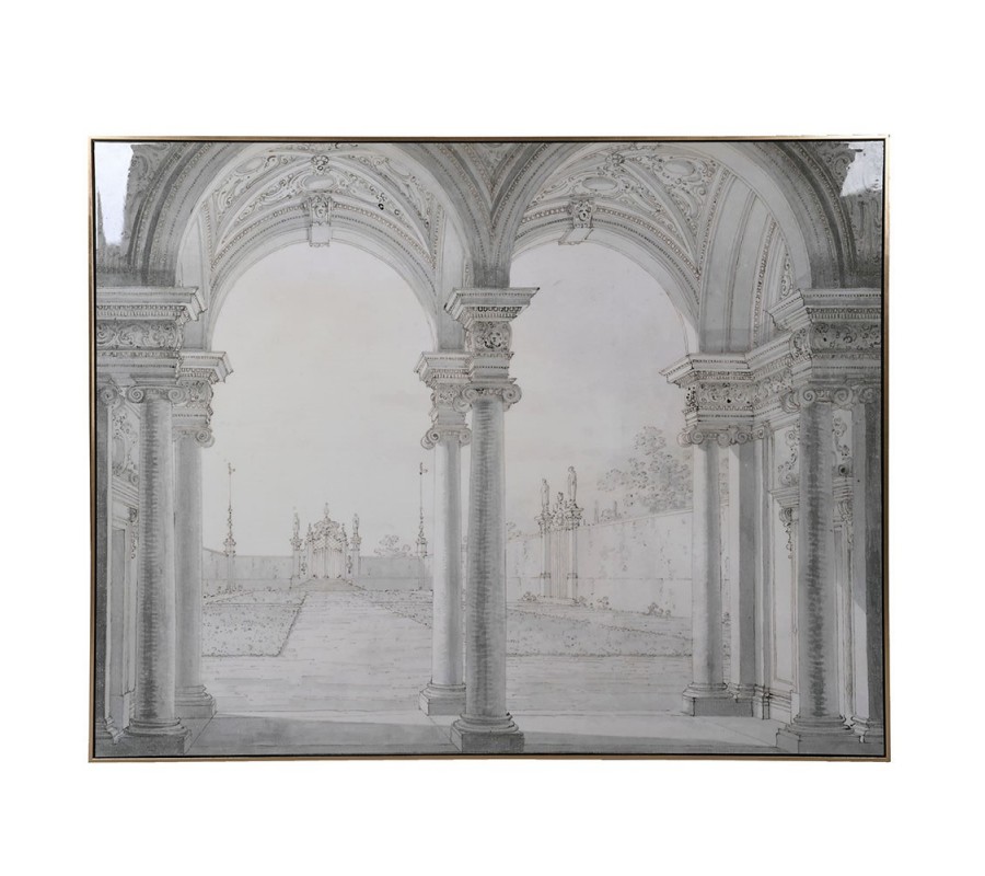 Dizajnový koloniálny obraz Pillars s barokovou kolonádou v čiernobielom prevedení a vintage zlatým rámom 150 cm