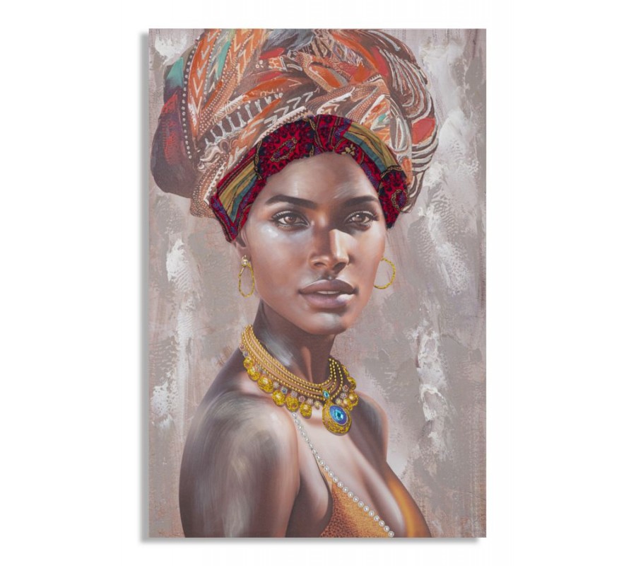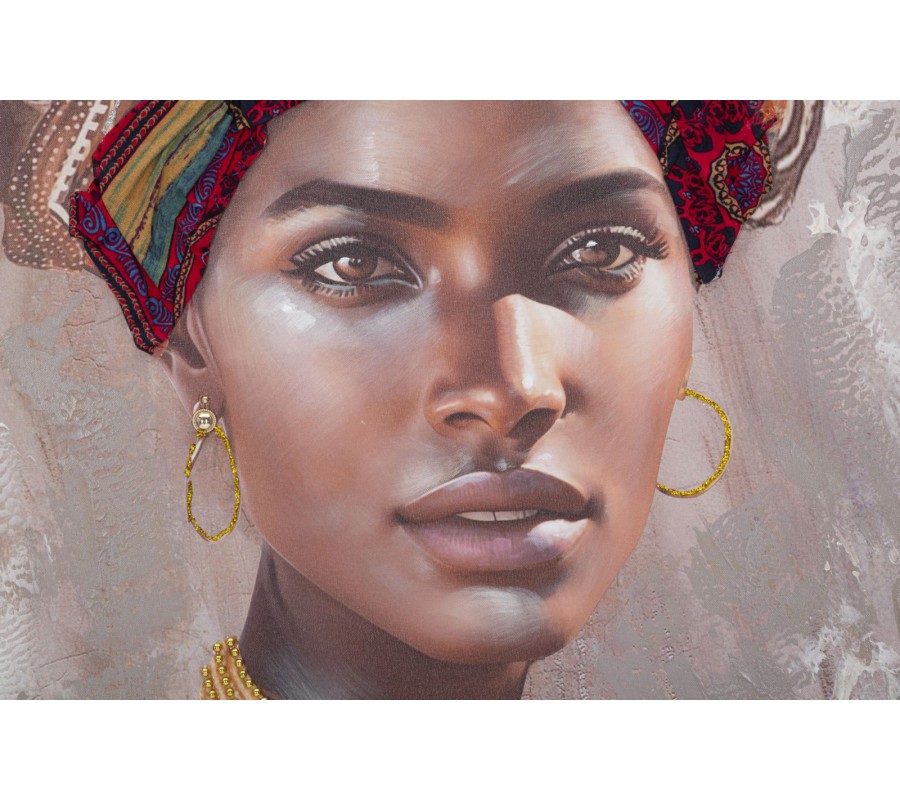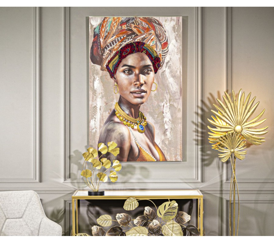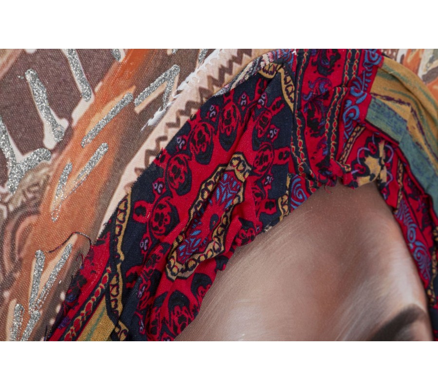 Obraz Saphira zachytáva ženský portrét s intenzívnym pohľadom, vyžarujúcim sofistikovanosť a eleganciu. Je spracovaný v hnedých, čiernych a zlatých tónoch, ktoré vytvárajú harmonickú kompozíciu a dodávajú mu luxusný vzhľad. Šatka vo vlasoch v kombinácii červenej, oranžovej a modrej je vyrobená z textilného materiálu, čím získava plastický a hmatateľný efekt.