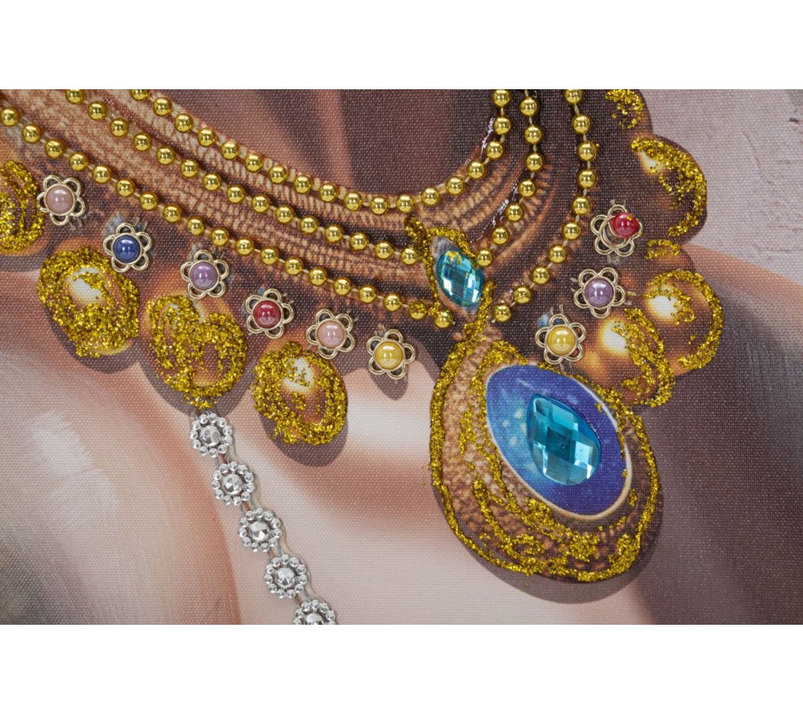 Jemné črty tváre, precízne vykreslené oči a plné pery, zdôrazňujú realistický dojem obrazu. Bohato zdobený náhrdelník a náušnice v zlatej farbe sú doplnené trblietavými aplikáciami, perličkami a kovovými detailmi, ktoré vytvárajú exkluzívny 3D efekt. Zlaté ornamentálne vzory a ligotavé akcenty navyše umocňujú umeleckú hĺbku diela.