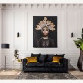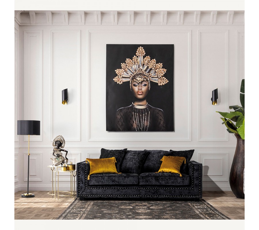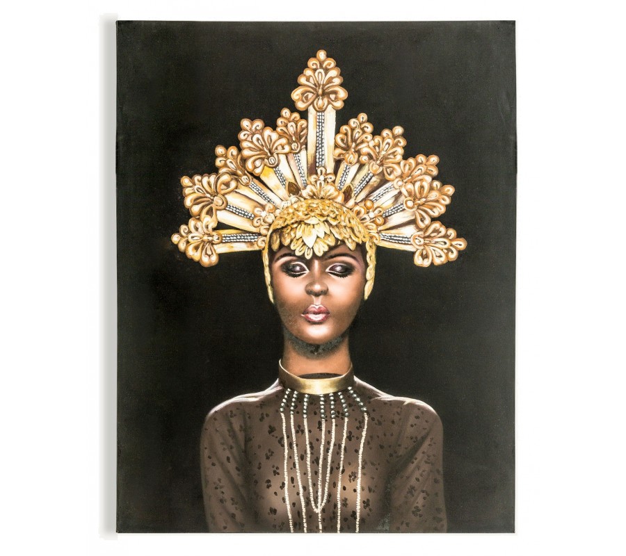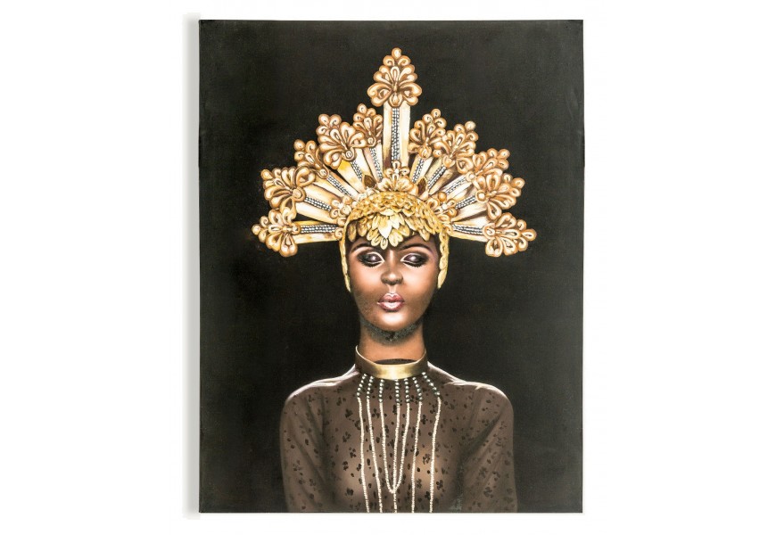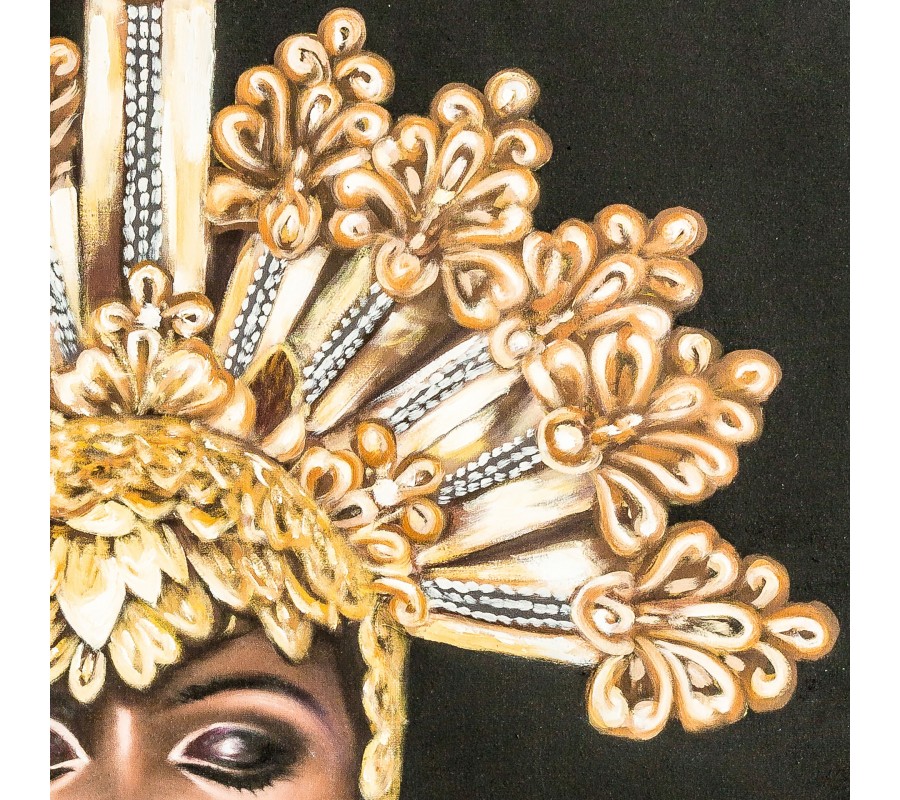 Umelecký obraz Rena predstavuje výnimočný dekoratívny prvok, ktorý v sebe spája noblesu, etnický pôvod a zmysel pre štýl. Maľba zobrazuje charizmatickú ženu v zlatej korunovej čelenke bohato zdobenej kvetinovými a perličkovými motívmi, ktoré sa lúčovito rozširujú smerom von a vytvárajú efekt slnečnej koruny. Vďaka kombinácii čierneho pozadia a zlatej výzdoby obraz pôsobí mimoriadne honosne a ušľachtilo.