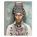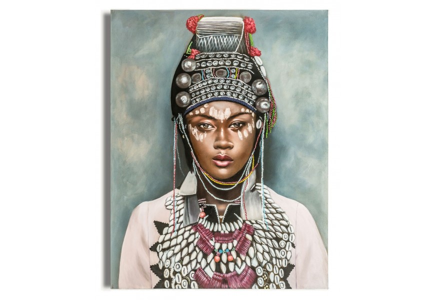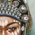 Závesný obraz Igu v obdĺžnikovom formáte prináša výnimočnú atmosféru do každého priestoru. Zobrazuje charizmatickú ženu v tradičnom etnickom odeve a pokrývke hlavy, bohato zdobenú mušľami, korálkami a perličkami, ktoré vyjadrujú silu kultúrnej identity a zmysel pre detail. Tvár ženy je vystihnutá do najmenších detailov s dôrazom na realistický pohľad a výrazy, pričom jemné biele maľovanie na tvári zvýrazňuje ceremoniálny charakter portrétu.