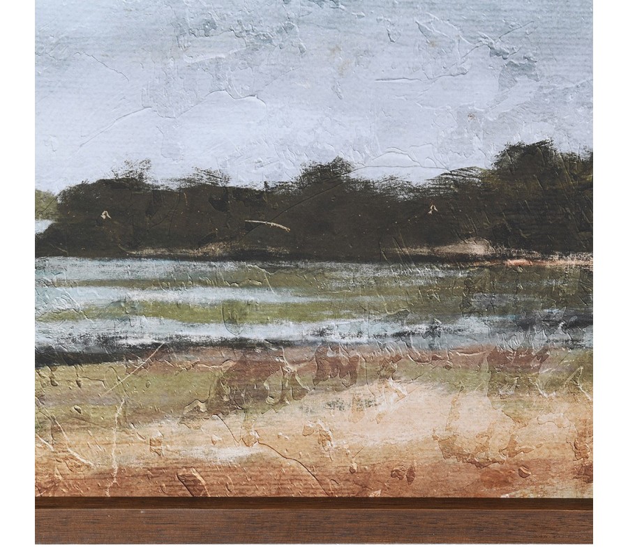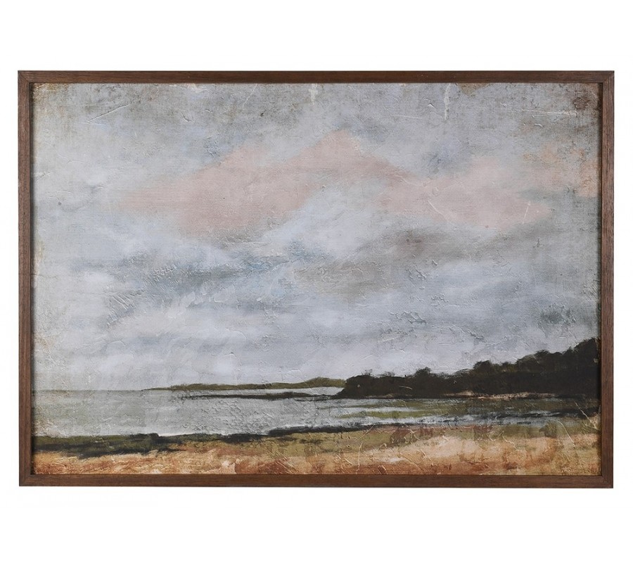 Štýlový koloniálny nástenný závesný obraz Hemina v obdĺžnikovom tvare je zasadený do masívneho rámu z jedľového dreva s jemným vyrezávaním a hnedou povrchovou úpravou. Jeho tlmená farebná paleta s jemnými sivými, modrastými a béžovými tónmi vytvára pokojnú atmosféru prírodnej krajiny s pohľadom na pobrežie a oblohu. Výjav evokuje nostalgické stíšenie, ktoré je typické pre umelecké diela v koloniálnom alebo vidieckom štýle.