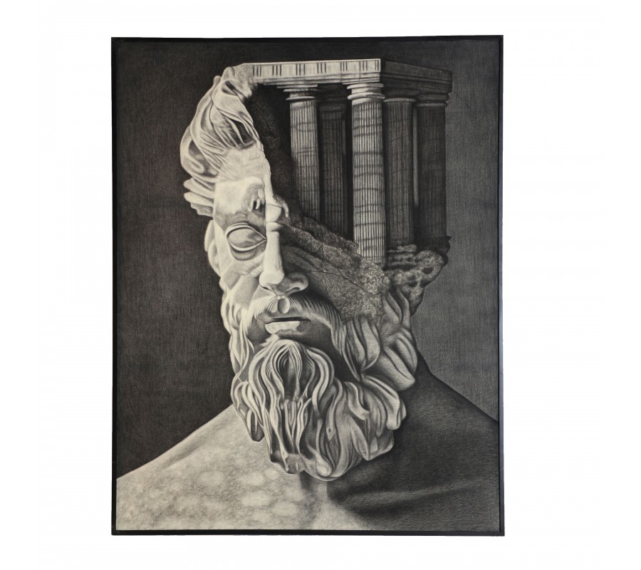 Luxusný ručne maľovaný obraz Mares vyniká výrazným výtvarným spracovaním, ktoré spája klasický antický motív mužskej busty s jemne surrealistickými architektonickými prvkami. V mieste lebky postavy sú zakomponované staroveké grécke stĺpy, ktoré vytvárajú hlboký symbolický odkaz na múdrosť, večnosť a plynutie času.