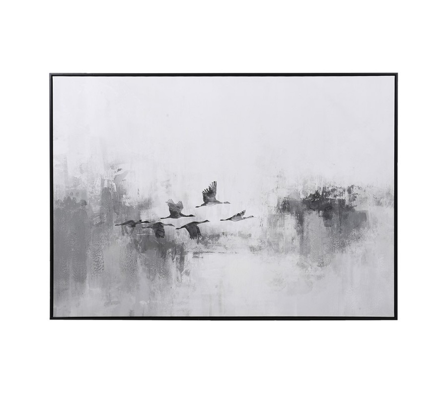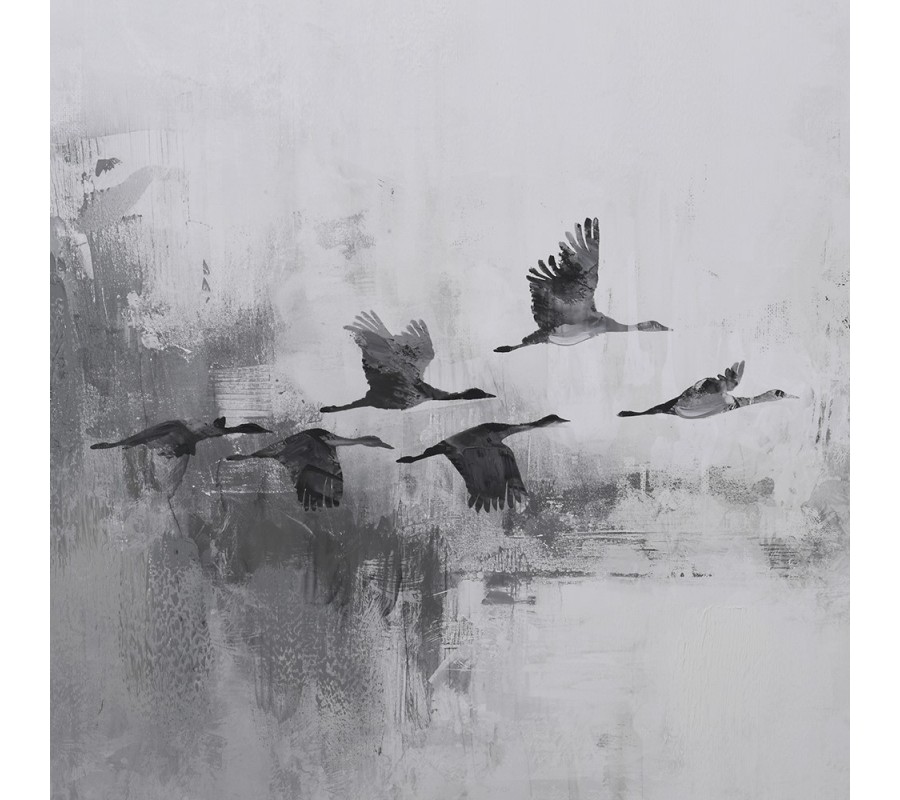 Obdĺžnikový závesný obraz Departure prinesie do interiéru harmóniu a pokoj. Je namaľovaný na kvalitnom plátne v decentných odtieňoch sivej a bielej s detailmi v čiernej farbe, pôsobí elegantne a nadčasovo. Motív šiestich kačiek letiaci preč symbolizuje voľnosť, slobodu a nový začiatok.