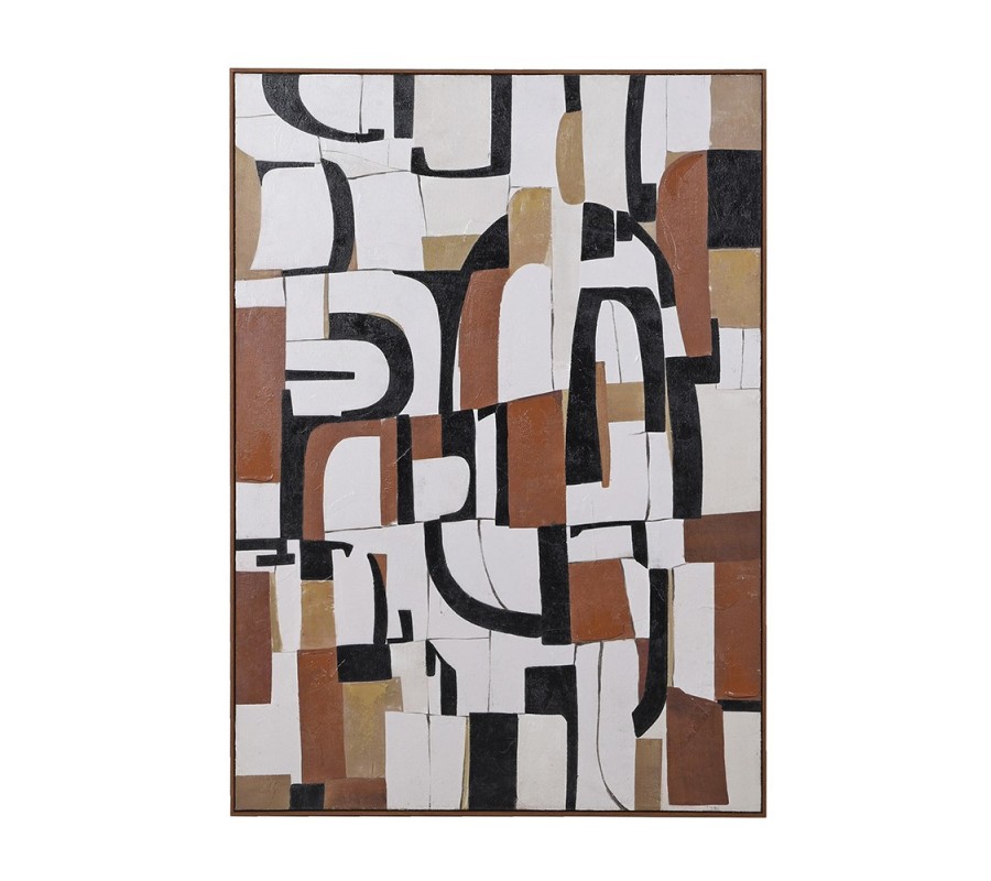 Obraz Mural je výrazné umelecké dielo v štýle art deco s prvkami abstrakcie, ktoré kombinuje oranžovú, čiernu a bielu farbu v dynamickej kompozícii. Tvary pripomínajú oblúky, polkruhy, obdĺžniky a nepravidelné bloky, ktoré sa prelínajú a vytvárajú zaujímavý kontrast ostrých a zaoblených línií.