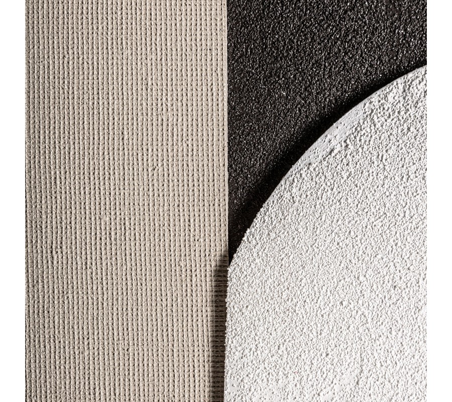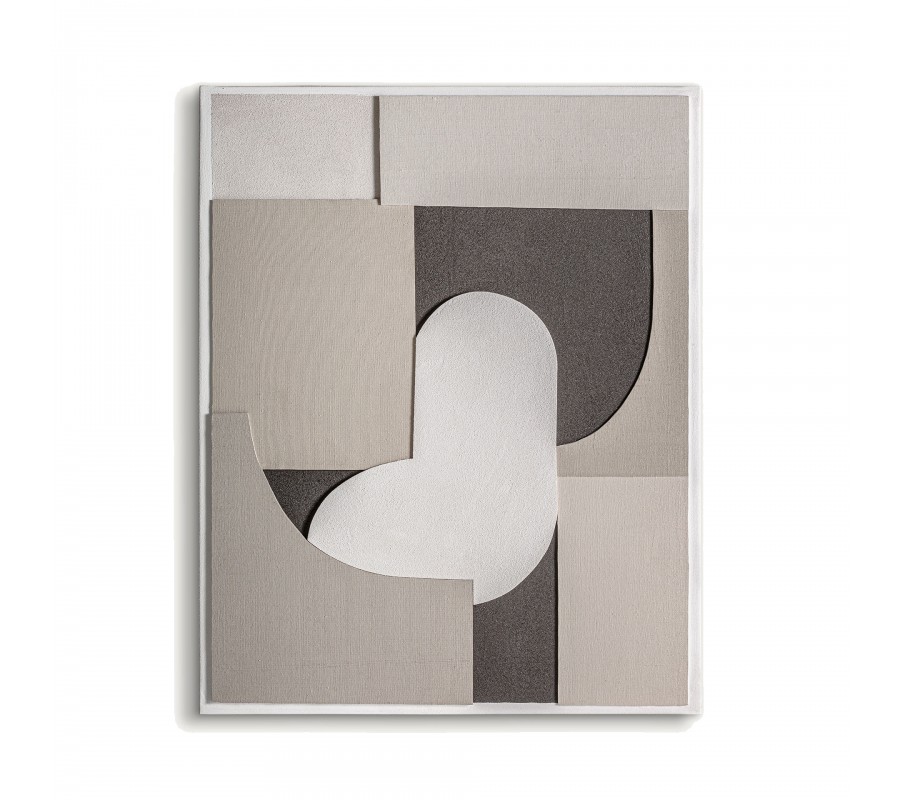 Luxusný obdĺžnikový nástenný obraz Artis v štýle moderného art deco zaujme na prvý pohľad svojou plastickou kompozíciou geometrických tvarov v prírodnej béžovej, hnedej a sivej farebnosti s doplnením o kontrastné čierne tóny. Jednotlivé časti pôsobia ako textilné alebo stavebné vzorky, ktoré pripomínajú kartón, omietku, drsný papier alebo betónový povrch. Vďaka rôznorodej štruktúre a jemným farebným prechodom pôsobí obraz minimalisticky, no zároveň hmatateľne zaujímavo. Povrch je reliéfny a vrstvenie vytvára elegantnú hru svetla a tieňa, pričom každý prvok vynikne inou hĺbkou či povrchovou úpravou. Celok je osadený do tenkého bieleho rámu, ktorý obraz diskrétne ohraničuje bez rušivých línií a zároveň zvýrazňuje čistotu výtvarného výrazu. Vyrobený je z borovicového dreva a plátna, ručne spracovaný s dôrazom na detail. Remeselná výroba zaručuje, že každý kus je originál, a preto sa môžu vyskytnúť drobné rozdiely v odtieňoch, tónoch alebo prirodzené nedokonalosti ako uzly, škvrny či praskliny, ktoré sú vnímané ako autentická hodnota diela. Obraz sa hodí do moderných a dizajnových interiérov, predovšetkým v štýle art deco, japandi, wabi-sabi či škandinávskom minimalizme. Výborne vynikne v obývačke, jedálni, predsieni alebo kancelárii, kde prinesie vizuálny pokoj, eleganciu a zároveň zaujímavý detail. Kombinujte ho s nábytkom v krémovej, svetlosivej, tmavohnedej alebo čiernej farbe, s doplnkami z dubového alebo borovicového dreva, mramoru, vlny, keramiky či kovu s matným povrchom. Ideálne vynikne na svetlej stene alebo v priestore s prírodnými materiálmi, ktoré podčiarknu jeho jemnú štruktúru a vrstvený charakter.