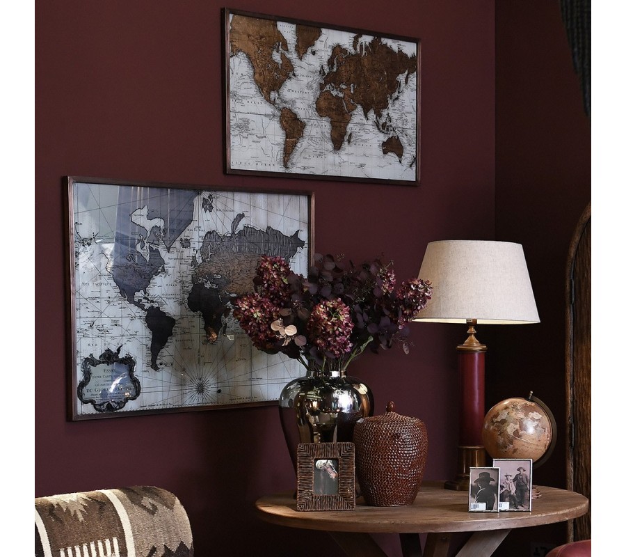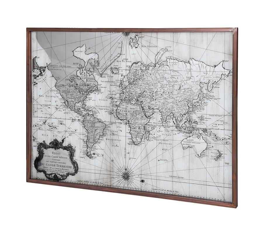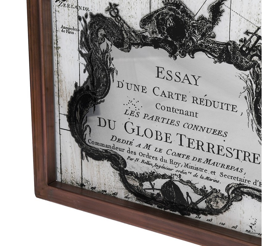Obraz World Map v štýle vintage je elegantným dekoračným prvkom, ktorý v sebe nesie nádych histórie a nadčasovej estetiky. Jeho dominantným motívom je detailná mapa sveta v jemnom sivobielom prevedení, ktorá pôsobí ako starý kartografický výtlačok. Obraz je orámovaný tenkým hnedým dreveným rámom, ktorý podčiarkuje jeho klasický charakter a zároveň ho chráni čisté priehľadné sklo.