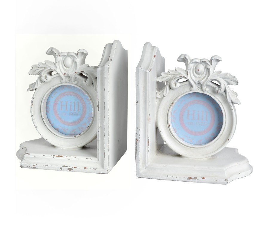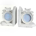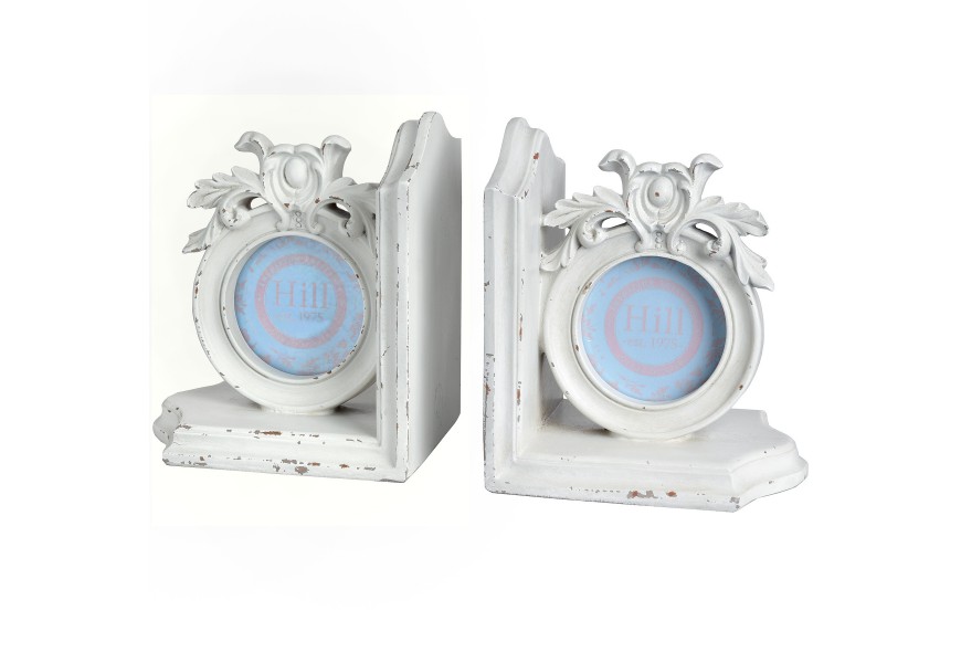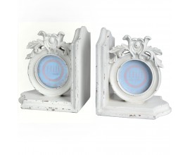 Set dvoch bielych zarážok na knihy s dekoratívnym oválnym rámčekom na obrázok či fotku.