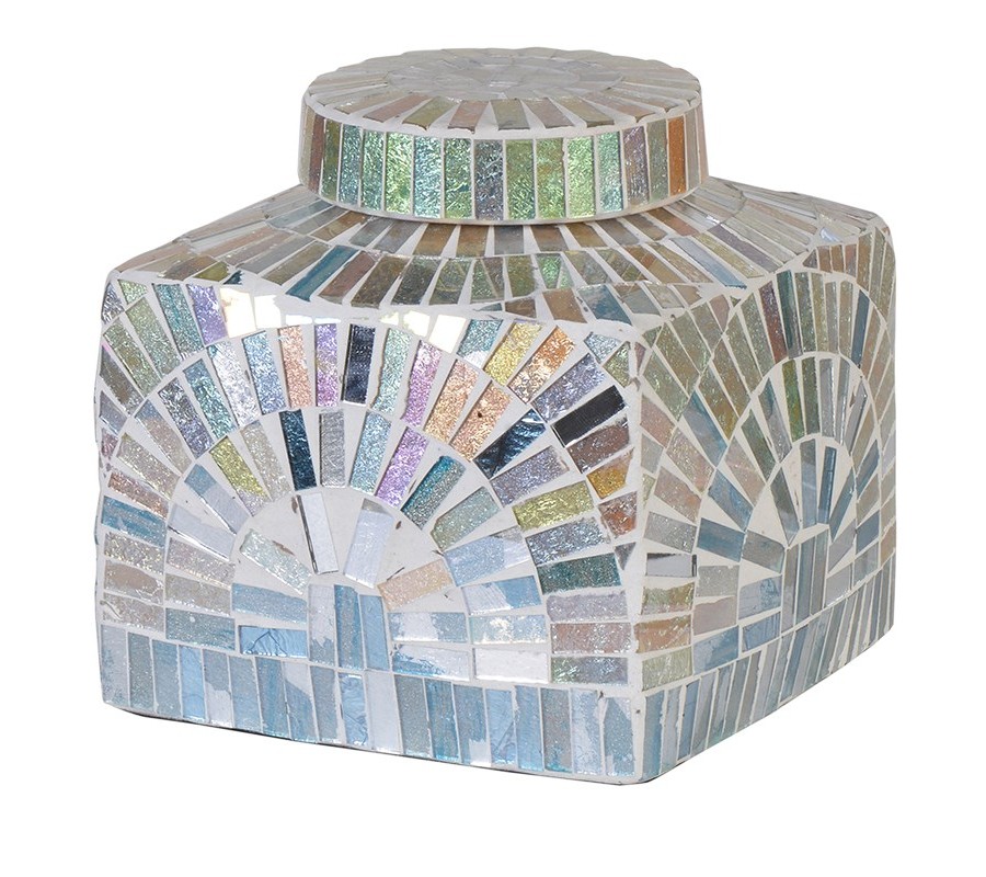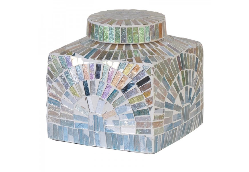 Dekoračná keramická nádoba vykladaná plôškami v rôznych farebných odtieňoch sa stane efektným interiérovým doplnkom, ktorý svojim vzhľadom krásne prežiari miestnosť.