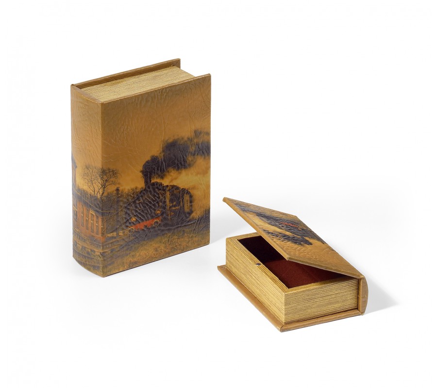 Sadu tvoria dve krabičky v tvare kníh. Zaujímavým detailom je, že veko sa otvára rovnakým spôsobom, ako sa otvára obálka knihy. Menšia krabičku je možné uložiť do väčšej. Povrch je potiahnutým ekokožou s efektom zámerného zostarnutia, ktorý dodáva dekorácii vintage vzhľad. Na oboch kusoch je zobrazený vlak prichádzajúci do stanice v starožitne pôsobiacom sépiovom hnedom prevedení.