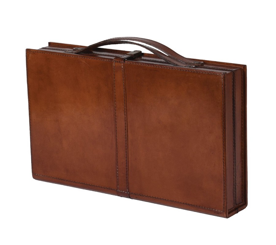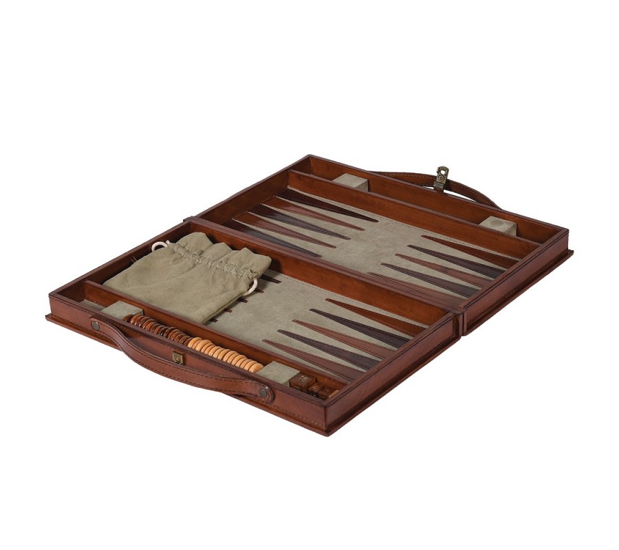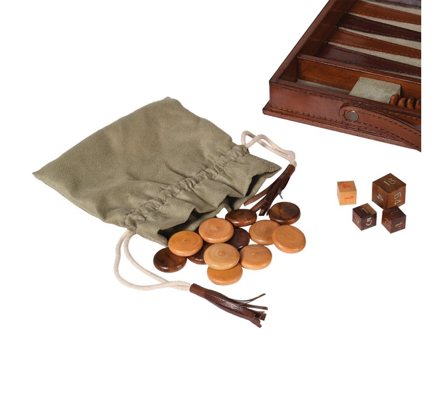 Luxusná vintage Backgammon súprava v tmavo hnedom koženom púzdre s vakom v sivej farbe 40cm