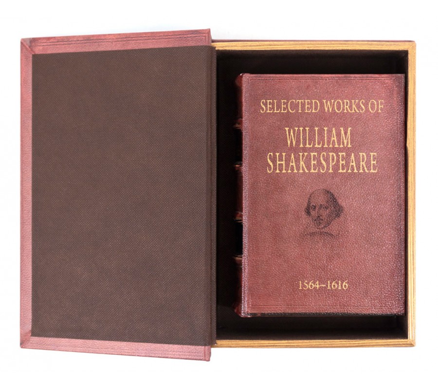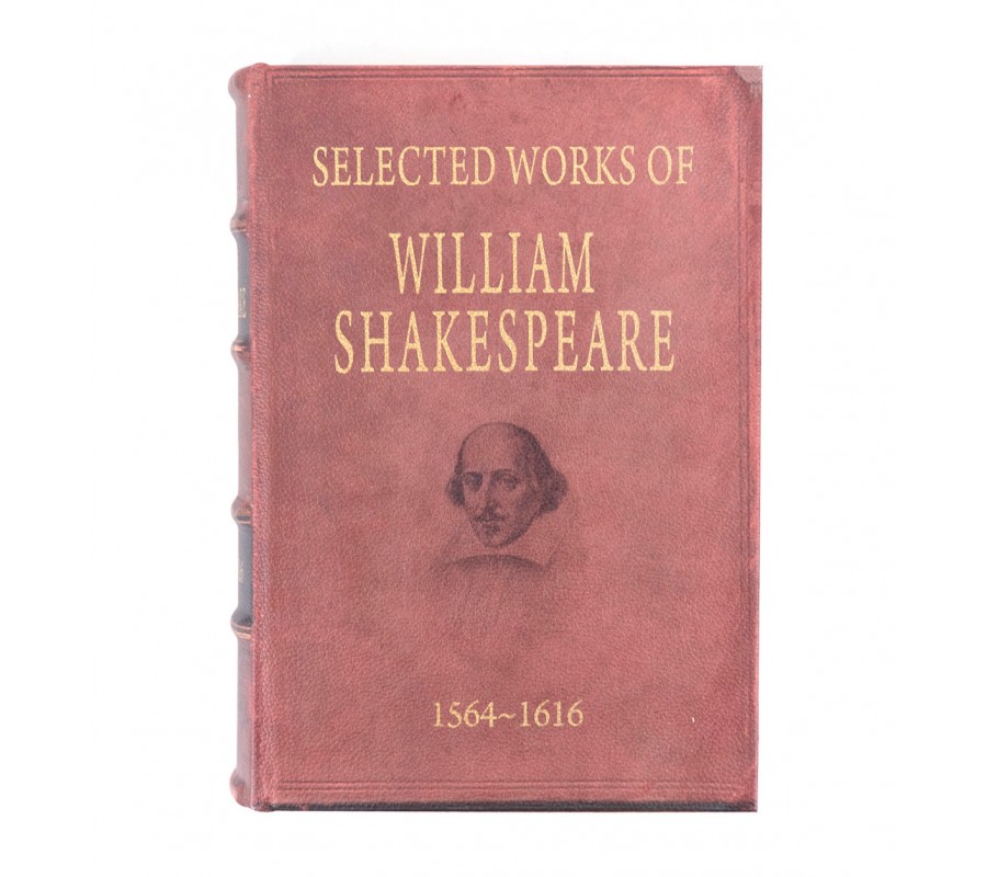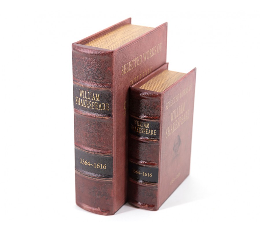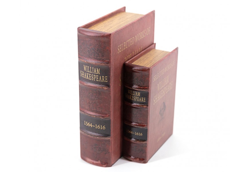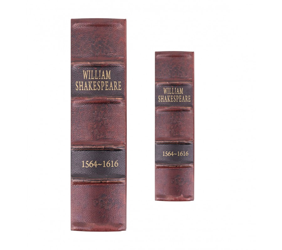 Štýlový set dvoch kníh s dekoratívnym motívom najlepšej tvorby Williama Shakespeara sú vhodným doplnkom do domácností milovníkov klasickej literatúry, drámy, či Shakespearovskej tvorby. Červené prevedenie obalu v eko koži vynikajúco vynikne v interiéroch s rustikálnym nábytkom v odtieňi čerešňa, napríklad na vystavenie v presklennej vitríne, alebo ležmo na spôsob šperkovnice napríklad na masívnej koloniálnej komode. Set je obohatený o čierne prvky na chrbátiku obalu a taktiež aj o povrchovú úpravu s náznakom opotrebovanosti vo vintage štýle. Kedže sa jedná o kožený produkt. tak môžeme odporúčiť čistenie vlhkou handričkou