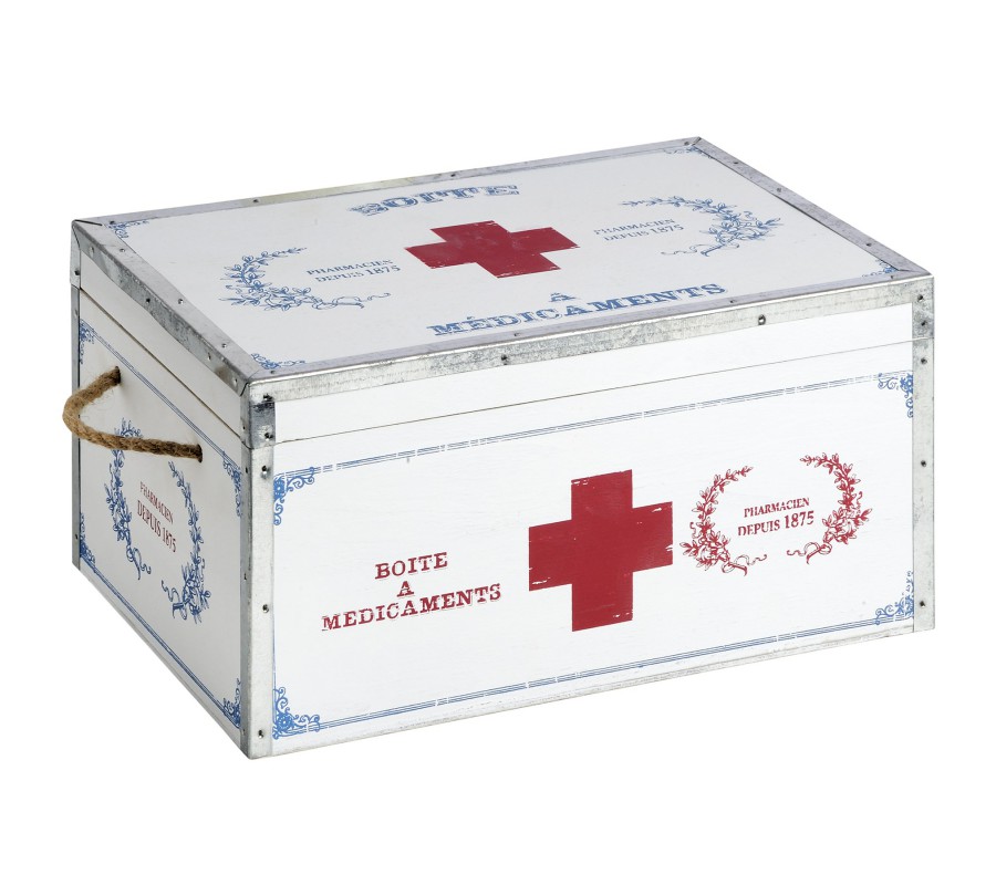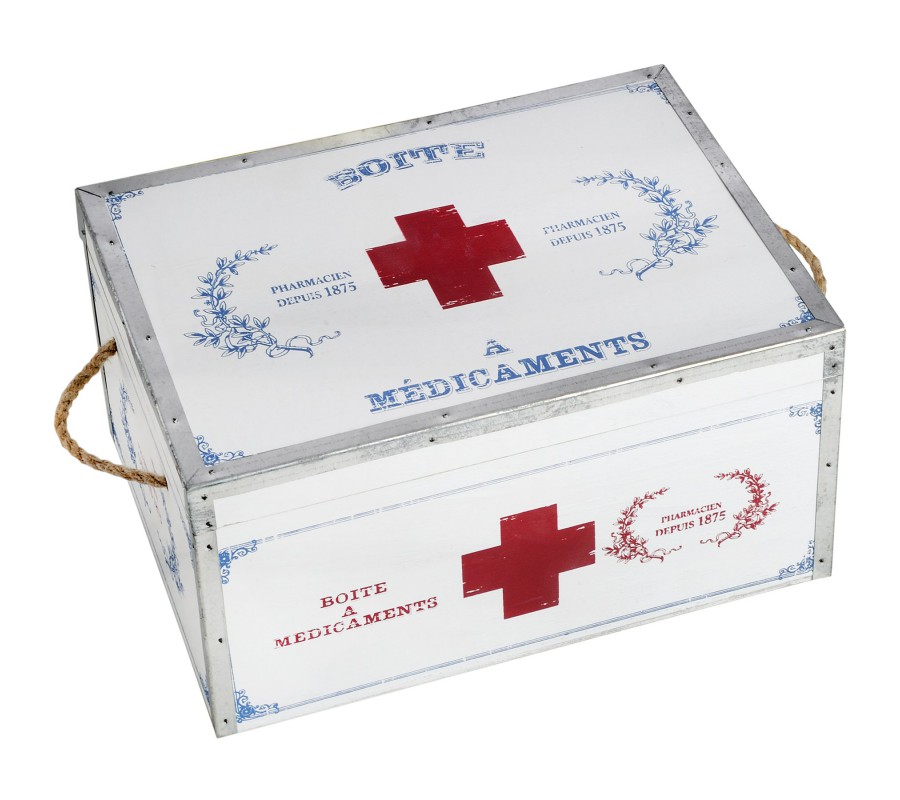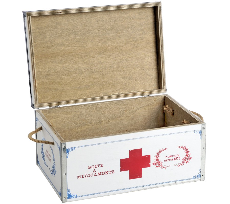 Drevená lekárnička v bielej farbe s potlačou do ktorej sa vám zmestia všetky potreby na domáce ošetrenie.