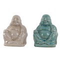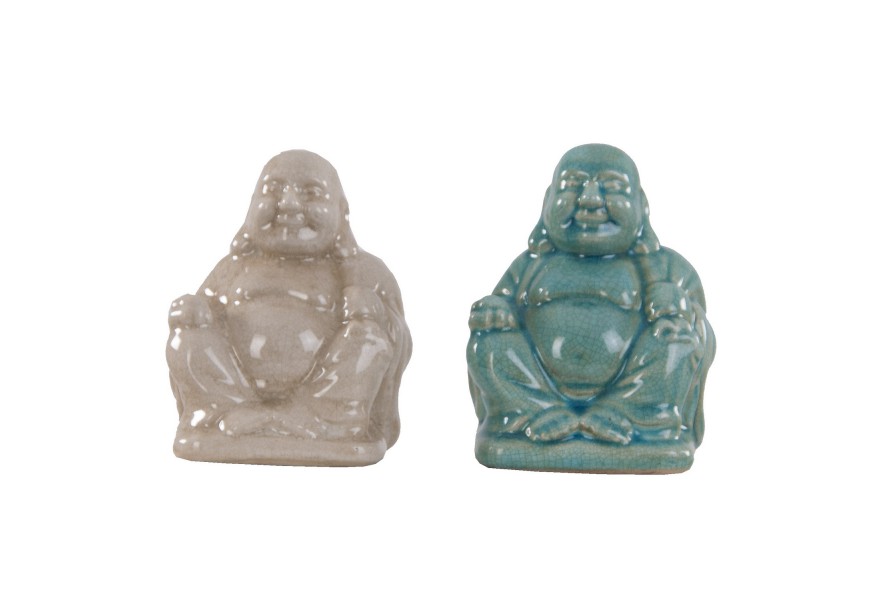 Sediaca postava Budhu s úsmevom a sklonenými rukami symbolizuje pokoj, šťastie a hojnosť. Vďaka decentnému farebnému prevedeniu je vhodná ako harmonizujúci prvok do interiérov v boho, etno alebo ázijskom štýle.