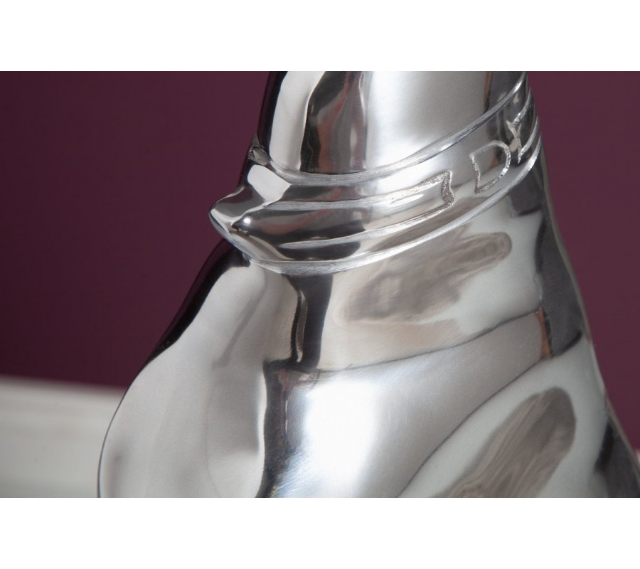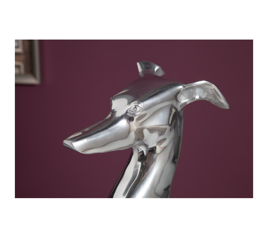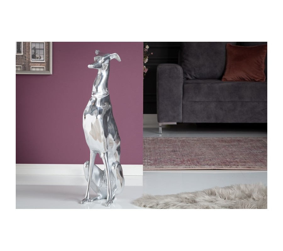 Dekoračná socha Meli v tvare sediaceho psa predstavuje štýlový doplnok do moderného interiéru. Vyrobená je z kovu s lesklou chrómovou povrchovou úpravou, ktorá vytvára efekt zrkadlového odrazu a pôsobí luxusne a elegantne. Hladké línie a lesk dodávajú soche súčasný vzhľad, zatiaľ čo štíhla silueta psa evokuje plemeno chrta, známe svojou eleganciou.