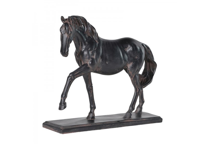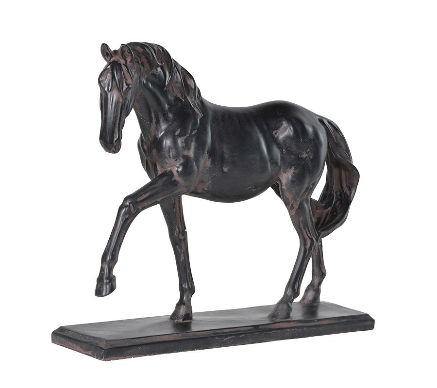 Dekoratívna soška Horse zobrazuje elegantného koňa v pohybe, s jednou zdvihnutou nohou, ktorá symbolizuje ladnosť a dynamiku. Je vyrobená z kameňa a má tmavú farbu s jemným patinovaním, čo jej dodáva vintage vzhľad. Povrch je hladký, s detailmi, ktoré zachytávajú svalstvo a realistické črty zvieraťa.