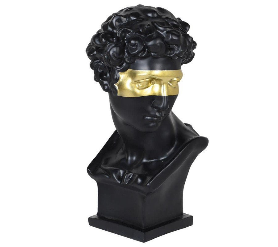 Klasický tvar busty Cabez je inšpirovaný krásou antiky a dotvorený odvážnou farebnou úpravou. Táto výrazná čierna dekorácia s luxusným zlatým detailom v podobe očnej masky sa bude vynímať medzi prvkami dekoratívneho Art-deco štýlu, dodá šťavu aj minimalistickému modernému interiéru, no zaručene nestratí sa ani v eklektických priestoroch plných hravých farieb, materiálov a vzorov. Dekoratívna busta Cabez do interiéru prináša antický pôvab a má schopnosť očariť už na prvý pohľad. Busta Cabez je vyrobená z kvalitnej a odolnej živice, vďaka čomu je napriek svojmu objemu značne odľahčená a nenesie ťažkú váhu materiálov z kameňa.