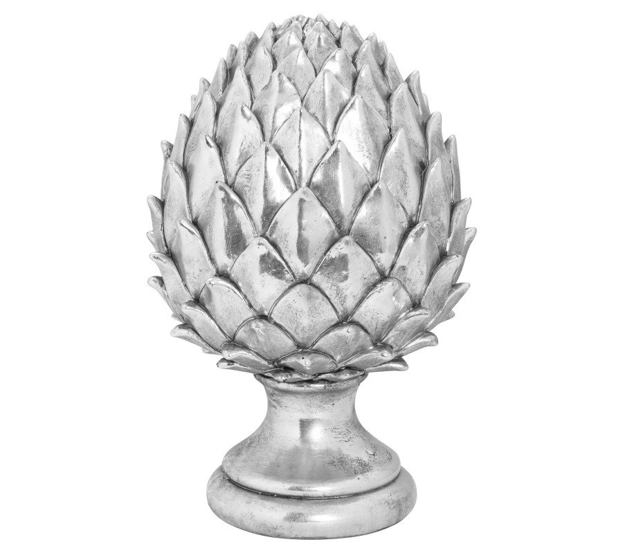 Štýlová dekoračná soška Borovicová šiška je doplnkom, ktorý poľahky doladíte do moderných i klasickejšie ladených interiérov. Táto jedinečná elegantná dekorácia oživí každý priestor, či už ide o knižnicu v obývačke, poličky vo vašej luxusnej pracovni či komodu v spálni. Šiška je vyrobená z keramiky a nesie sa v dizajnovej striebornej farbe, ktorú ľahko dokombinujete aj s pestrejším nábytkom či doplnkami. Soška je umiestnená na okrúhlom podstavci.