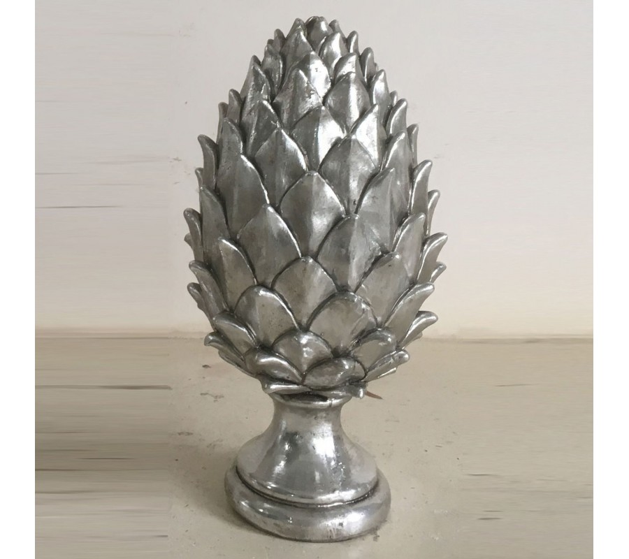 Dizajnová keramická dekorácia Borovicová šiška striebornej farby 30cm
