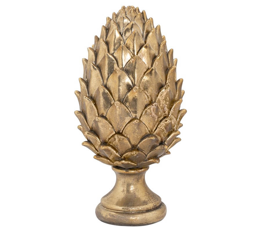 Dizajnová dekoračná soška Borovicová šiška je štýlovým doplnkom, ktorým ozdobíte moderné i klasickejšie ladené priestory. Táto jedinečná elegantná dekorácia oživí každý interiér a vynikne na rôznych miestach, či už sa jedná o regál alebo knižnicu vo vašej obývačke, poličku v luxusnej pracovni alebo komodu v spálni. Šiška je vyrobená z keramiky a nesie sa v dizajnovej zlatej farbe, ktorú ľahko dokombinujete aj s pestrejším nábytkom či doplnkami. Soška je umiestnená na okrúhlom podstavci.