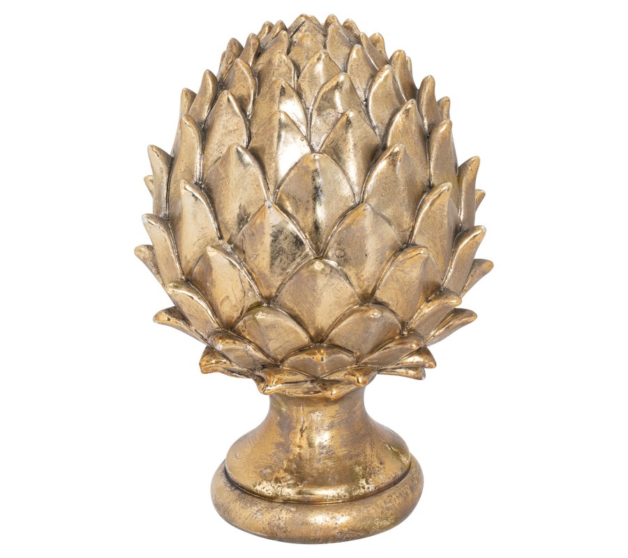Dizajnová dekoračná soška Borovicová šiška je vkusným a elegantným doplnkom, ktorým si štýlovo vyzdobíte moderné i klasickejšie ladené priestory. Táto jedinečná elegantná dekorácia oživí každý interiér a vynikne na rôznych miestach, či už sa jedná o regál alebo knižnicu vo vašej obývačke, poličku v luxusnej pracovni alebo komodu v spálni. Šiška je vyrobená z keramiky a nesie sa v dizajnovej zlatej farbe, ktorú ľahko dokombinujete aj s pestrejším nábytkom či doplnkami. Soška je umiestnená na okrúhlom podstavci.