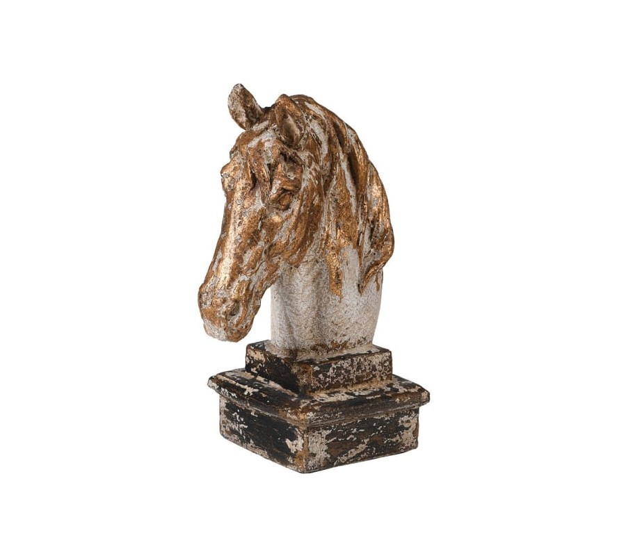 Dekoratívna soška Horsey si svoje miesto nájde vo vintage ladených obývačkách, spálňach či pracovniach. Táto štýlová busta koňa pôsobí elegantným dojmom s ndáychom vintage štýlu a vo vašom interiéri krásne doplní napríklad priestory závesných poličiek, komody či príručného stolíka. Kamenná socha sa nesie v sivohnedej farbe s výraznou patinou zostarnutia, vďaka ktorej dostáva autentický vintage nádych. Busta je umiestnená na tmavom podstavci, čím nadobúda impozantný dojem. Dotvorte si vo vašom interiéri dokonalý vintage efekt kombináciou sošky Horsey s masívnym drveveným nábytkom či čalúneným zamatovým kreslom alebo sedačkou, nástenným obrazom či zrkadlom s vyrezávaným rámom alebo inými štýlovými doplnkami.