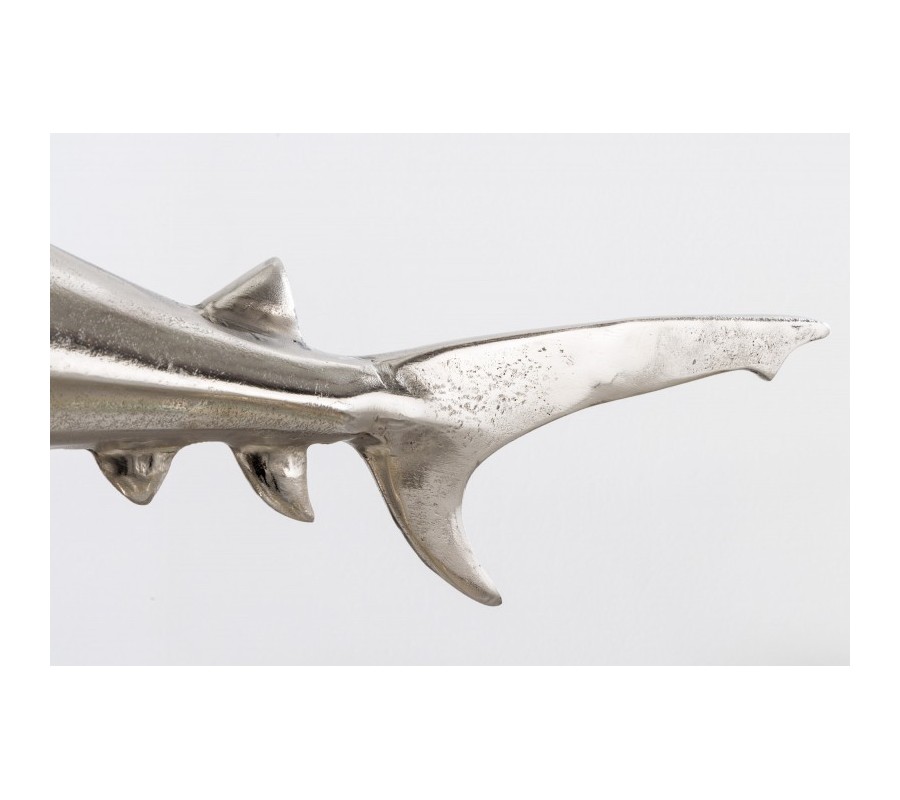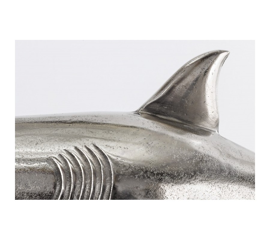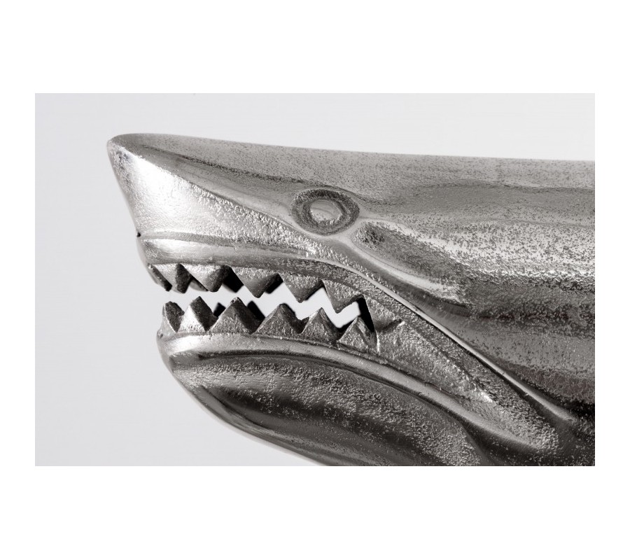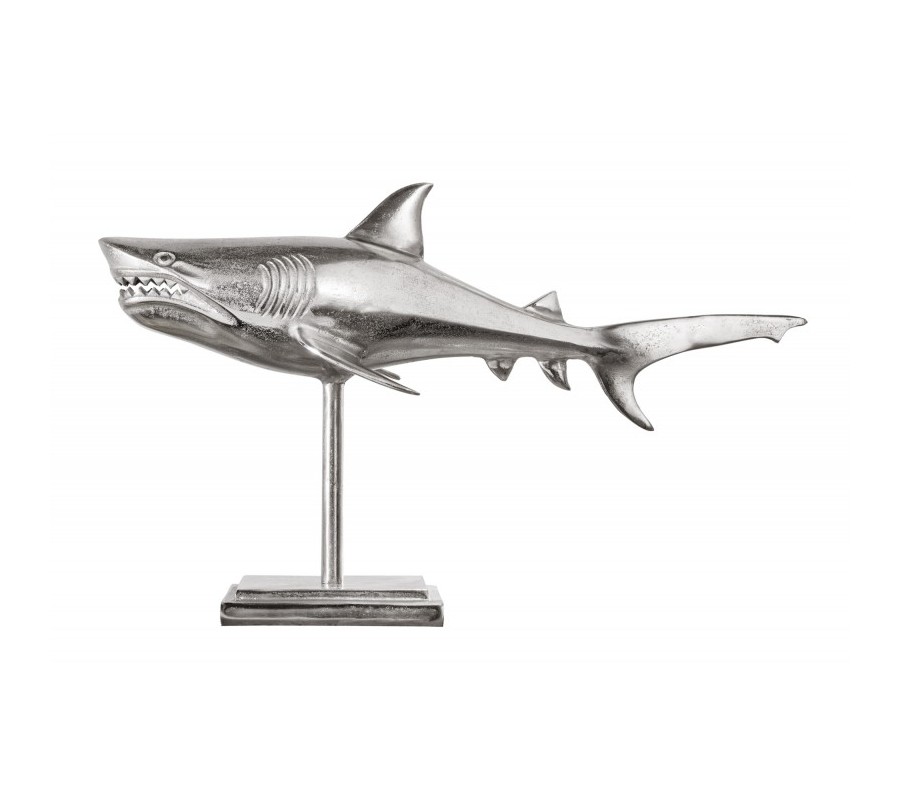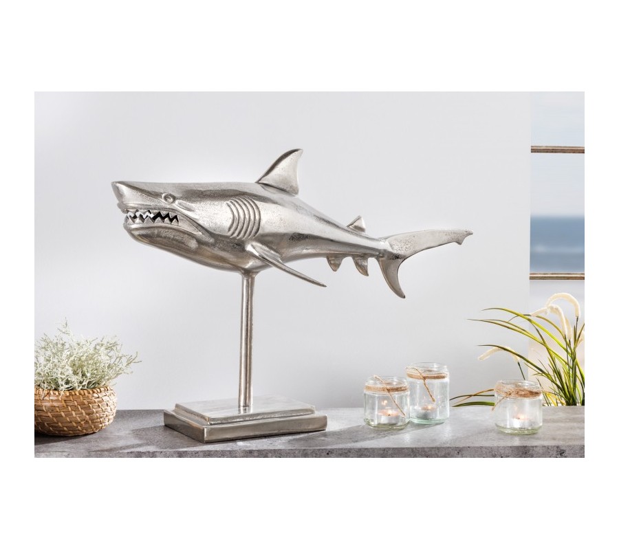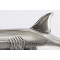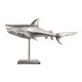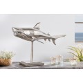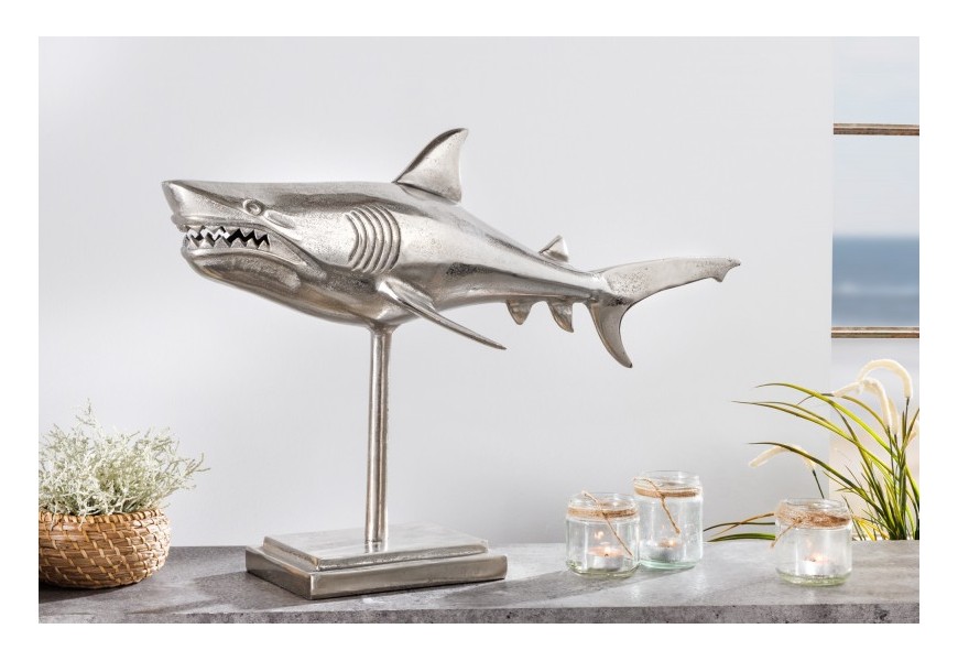 Dizajnová dekoračná soška žralok Perry v striebornej farbe z kovovej zliatiny na podstavci 68cm