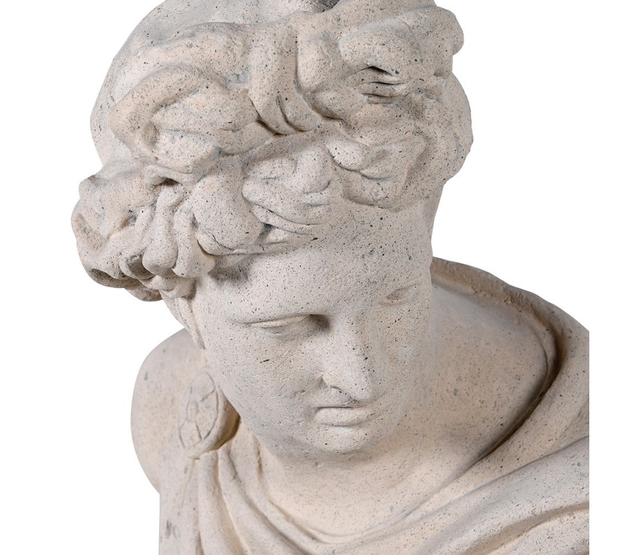 Vyrobená z kvalitného epoxidu, táto busta nielenže vyniká odolnosťou voči poveternostným vplyvom, ale aj svojím vzhľadom dokonale imituje vlastnosti a textúru prírodného kamene. Tento materiál prináša kombináciu trvácnosti a estetiky, čo umožňuje jej umiestnenie v exteriéri, napríklad vo vašej záhrade alebo na terase, ale rovnako sa hodí aj do interiérových priestorov. V domácnosti môže pôsobiť ako elegantný dekoračný element, ktorý pridáva nádych antiky obývacej izbe, knižnici alebo hocikde inde, kde chcete zvýrazniť kultúrny a historický význam.