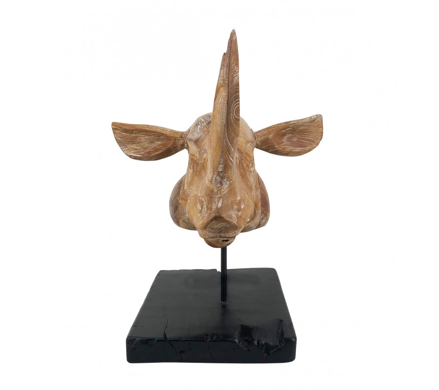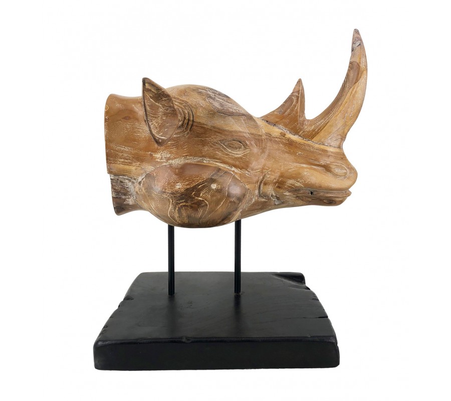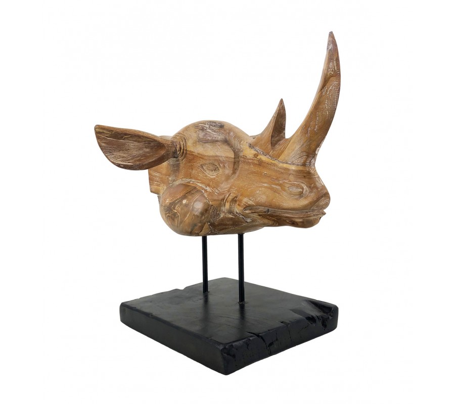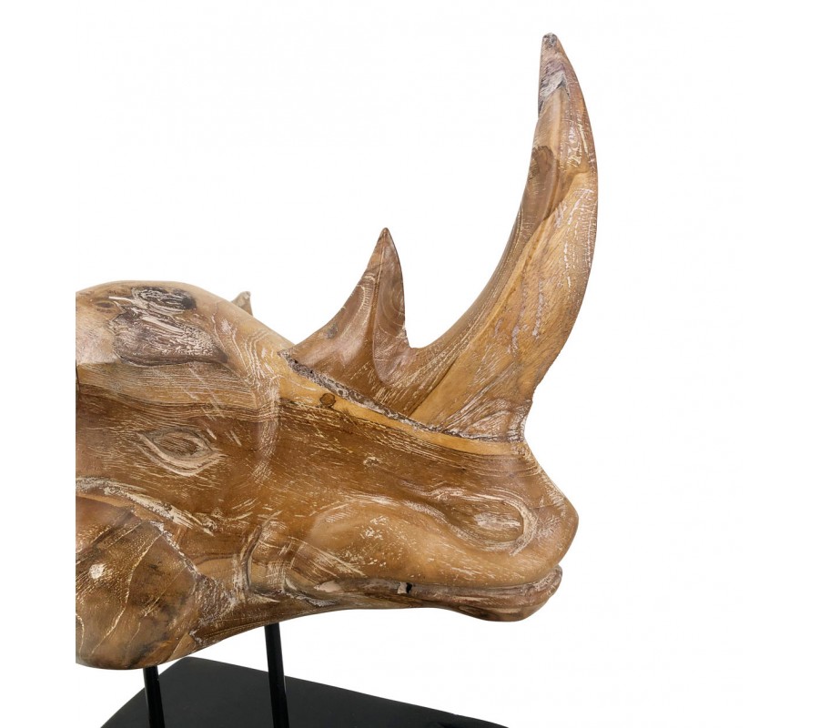 Dizajnová etno hnedá dekorácia Rhino z masívneho dreva s čiernym podstavcom 45 cm