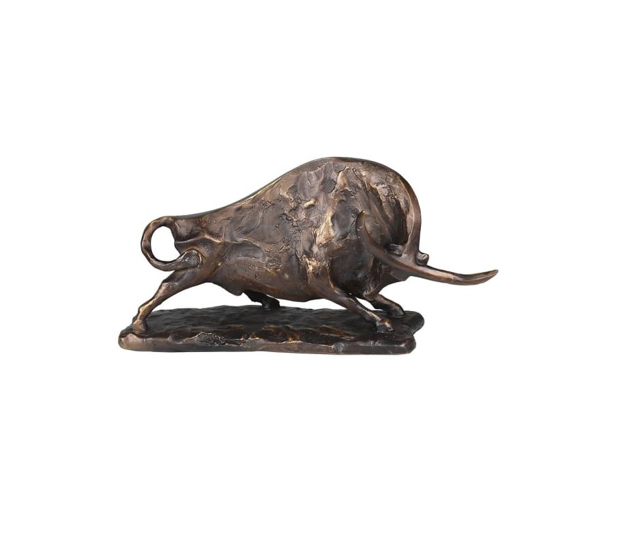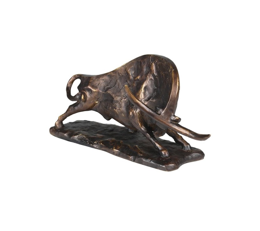 Socha Bull zobrazuje býka v dynamickom pohybe, ktorý svojou mohutnou postavou a napätou energiou vyjadruje silu a odhodlanie. Vyrobená zo živice, jej povrch je hrubý a štruktúrovaný, čo dodáva realistický a dramatický efekt. Povrch je pokrytý patinou v bronzových a medených odtieňoch, ktoré zvýrazňujú detaily svalov a pohybu zvieraťa, pričom vytvárajú dojem starobylosti a umeleckého spracovania.