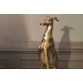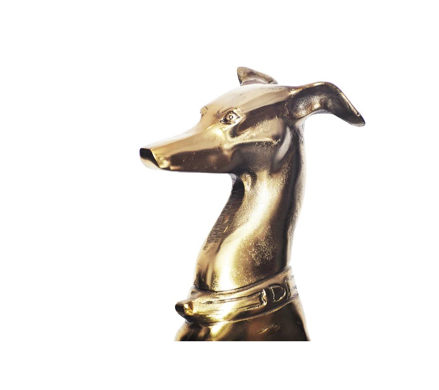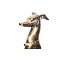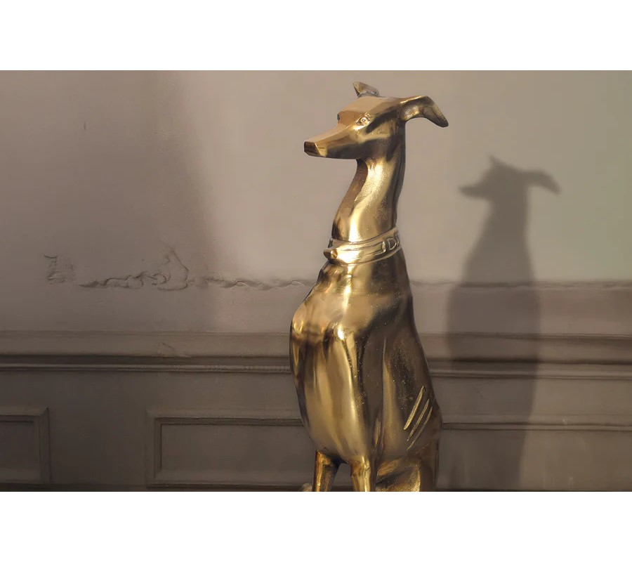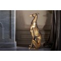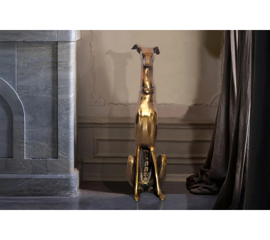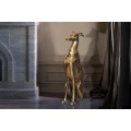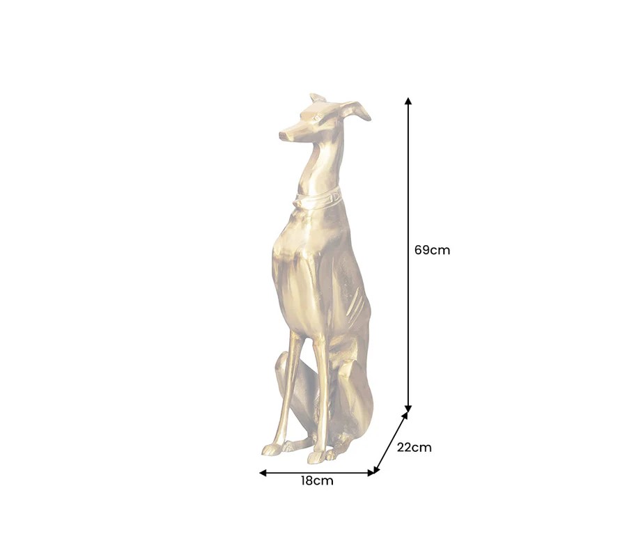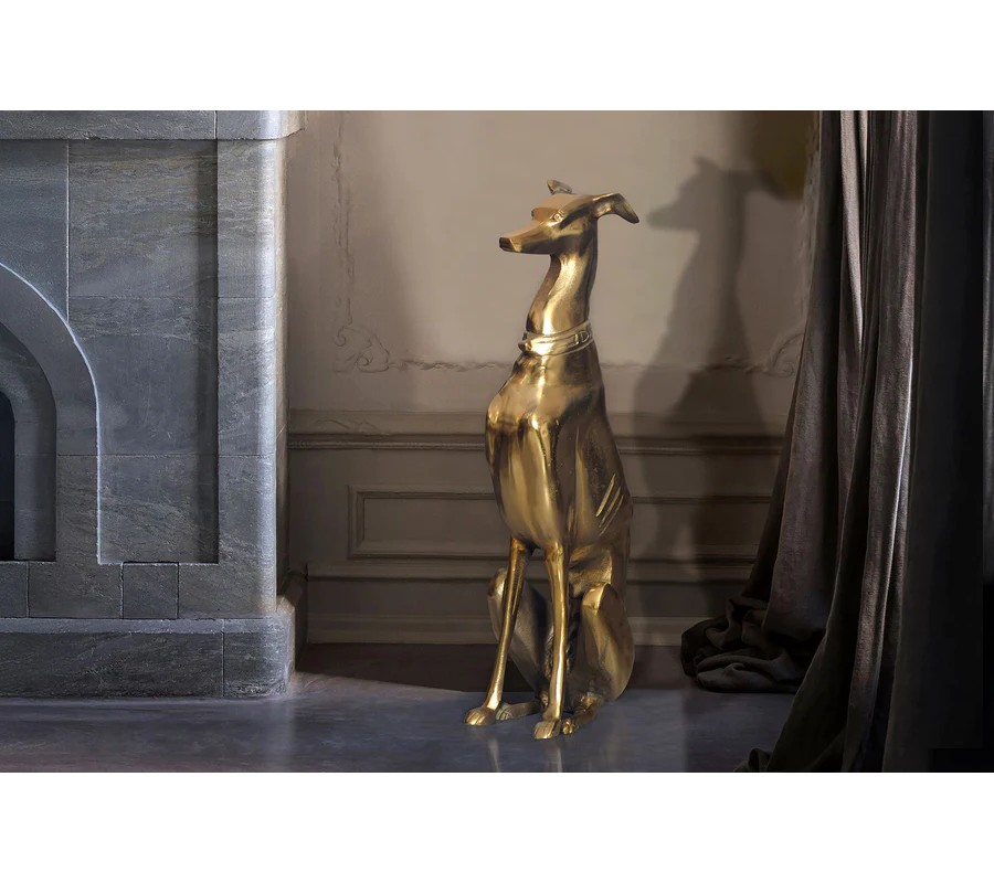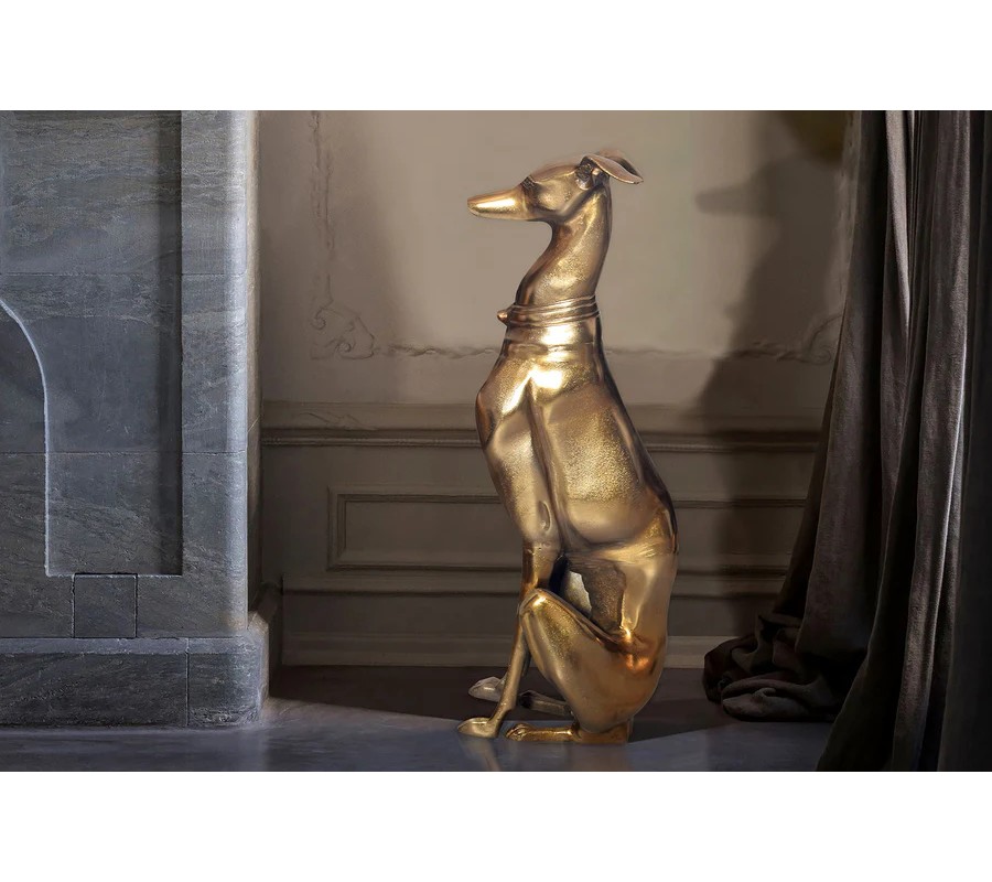 Vysoká socha psa Nartas v polohe sedu je luxusná dekorácia vyrobená z kovu v zlatej farbe s lesklým povrchom. Socha zachytáva eleganciu a vznešenosť chrta, konkrétne greyhounda, známeho svojou štíhlou, atletickou postavou a aristokratickým držaním tela. Detailne prepracované línie tela, dlhý, elegantný krk a výrazný obojok dodávajú soche sofistikovaný vzhľad, ktorý dokonale zapadne do glamour a art deco interiérov.