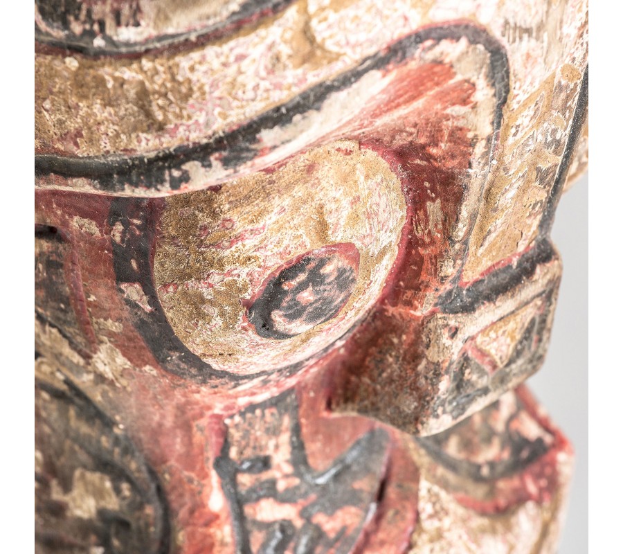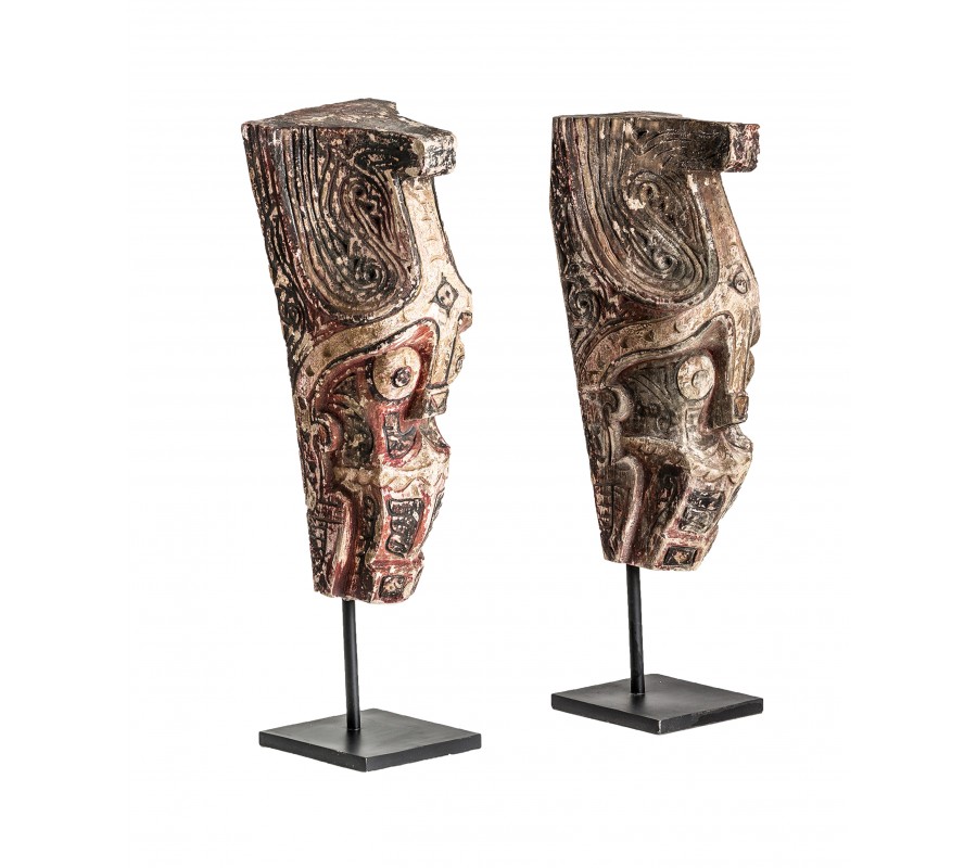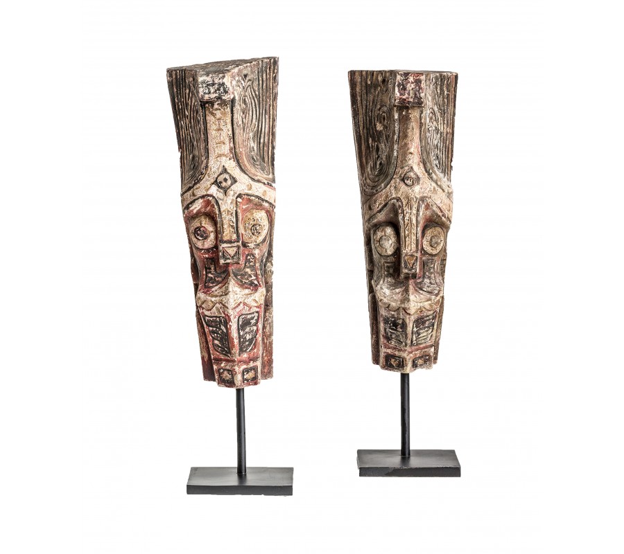 Luxusná etno sada dvoch sošiek Mulan predstavuje výrazný dekoratívny prvok, ktorý okamžite pritiahne pozornosť svojím autentickým remeselným spracovaním a kultúrnou symbolikou. Obidve sošky majú podobu vyrezávaných tvárí alebo masiek s abstraktnými rysmi a detailnou rytou ornamentikou, ktorá odkazuje na tradičné primitívne umelecké formy z afrického alebo oceánskeho prostredia.