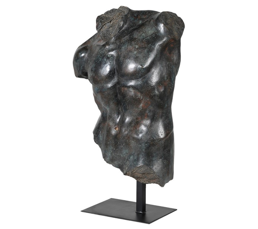 Torzo je osadené na obdĺžnikovej podstave z matného čierneho kovu, ktorá zaručuje stabilitu a zároveň podporuje moderný až industriálny vzhľad celku.