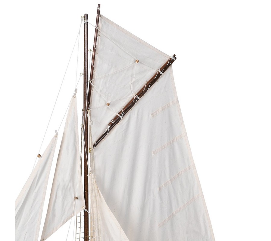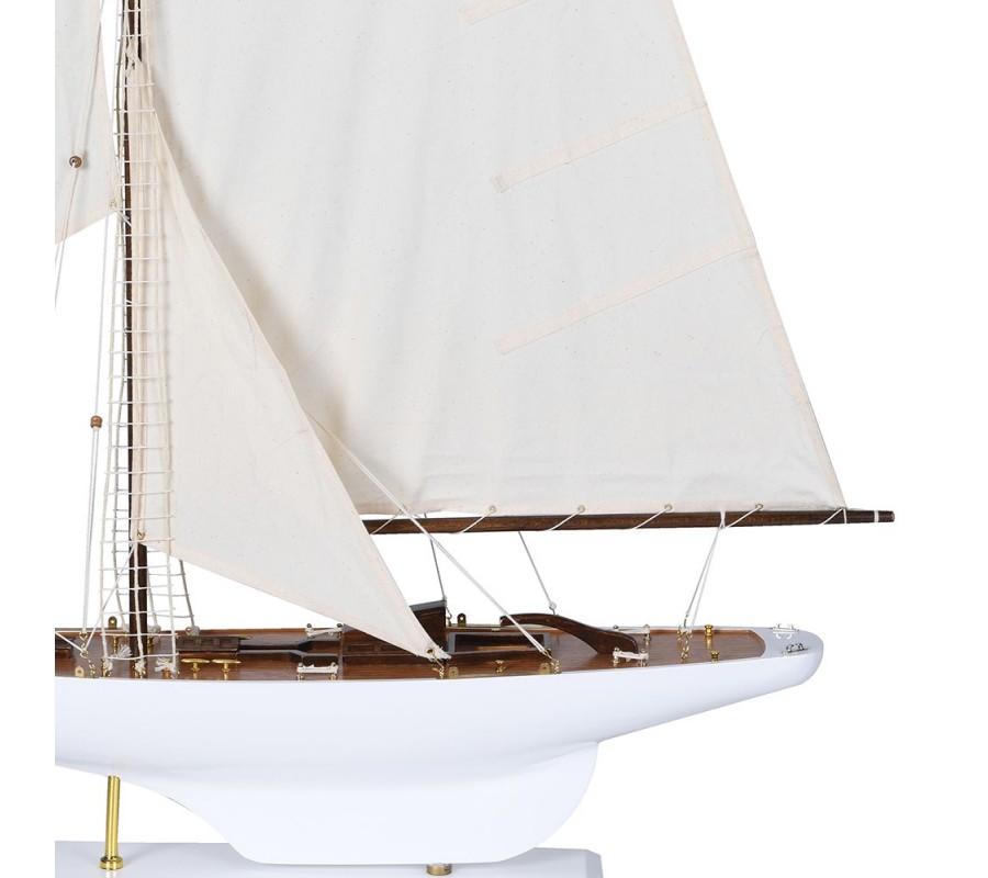 Výrazným prvkom sú kovové zlaté detaily, ktoré dopĺňajú stožiare a konštrukciu lode, čím dekorácia získava elegantný a luxusný vzhľad. Plachty z bavlny pôsobia jemne a autenticky, pričom kontrast medzi bielou a hnedou farbou podčiarkuje koloniálny charakter. Celok je umiestnený na stabilnej obdĺžnikovej podstave, ktorá umožňuje dekoráciu jednoducho vystaviť na komode či polici.