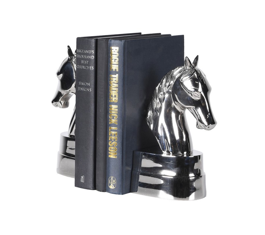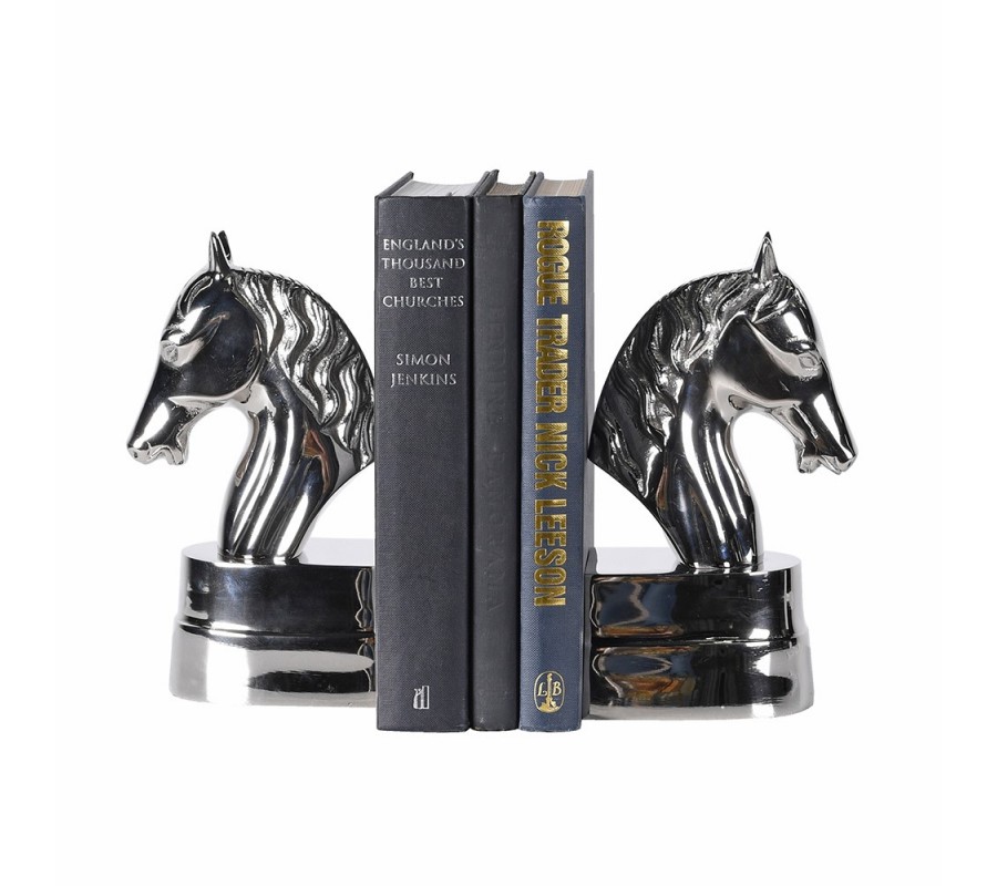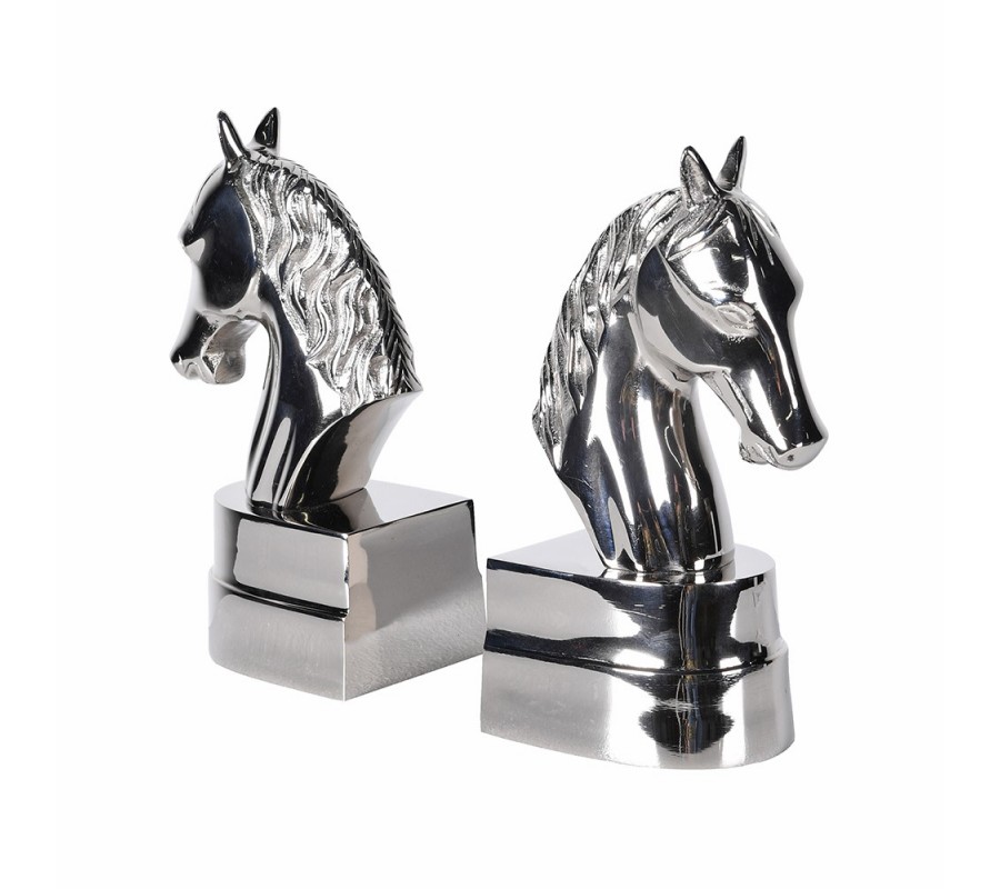 Sada dvoch kovových chrómových strieborných zarážok na knihy Equus prinesie do vášho interiéru jedinečný koloniálny nádych a noblesu. Tvar konských hláv pôsobí majestátne a dodáva zarážkam výrazný dekoratívny charakter.