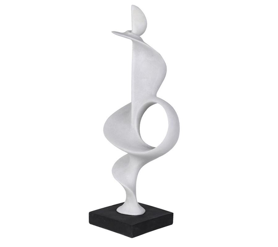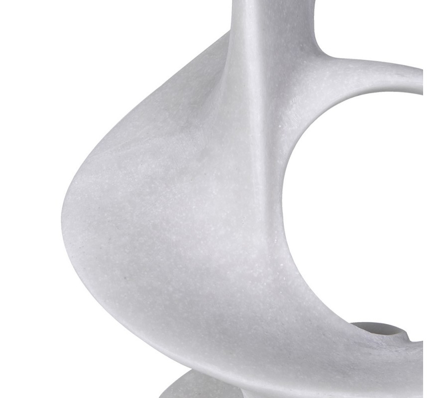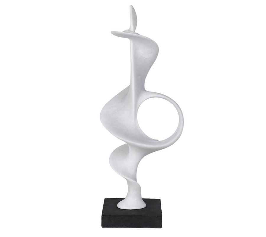 Tento umelecký objekt má oblý a skrútený dizajn s jemnými rotáciami a otvoreným kruhovým prvkom v strede, čo mu dodáva moderný a futuristický nádych. Je to dekorácia, ktorá okamžite púta pozornosť a stáva sa centrom vizuálneho záujmu.