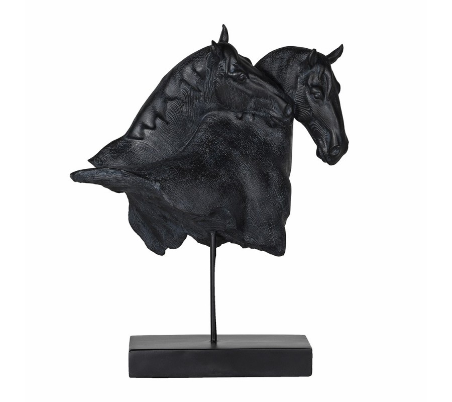 Štýlová dekoratívna socha dvoch konských hláv Gatern v elegantnej čiernej farbe pôsobí výrazne, umelecky a nadčasovo. Dynamické spracovanie hláv vytvára dojem pohybu a sily, zatiaľ čo matný čierny povrch dodáva soche moderný a sofistikovaný charakter. Socha je vyrobená zo živice a umiestnená na tenkej kovovej tyči s pevnou obdĺžnikovou podstavou, vďaka čomu pôsobí ľahko, vzdušne a zároveň stabilne. Hodí sa najmä do moderných, industriálnych, minimalistických aj glamour interiérov, do obývacej izby, pracovne, haly alebo reprezentatívnych priestorov, kde sa stane výrazným dizajnovým akcentom. Výborne sa kombinuje s čiernymi, sivými a prírodnými tónmi, kovovými doplnkami, sklom, betónom, tmavým drevom alebo kožou a krásne vynikne aj v kontraste so svetlým nábytkom či neutrálnymi stenami.