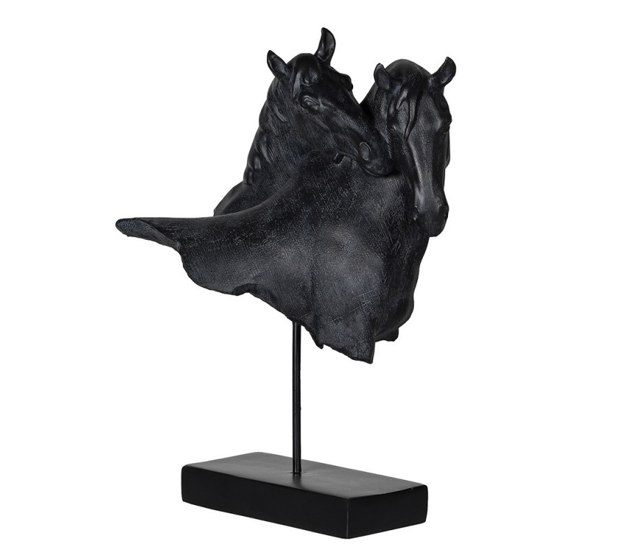 Konské hlavy sú umiestnené na tenkej čiernej kovovej tyči, ktorá plynulo prechádza do pevnej obdĺžnikovej podstavy. Konštrukcia pôsobí ľahko a vzdušne, no zároveň stabilne a vyvážene. Celkový dojem je moderný, premyslený a vizuálne luxusný – ide o dekoráciu, ktorá má charakter dizajnového objektu, nie len doplnku.